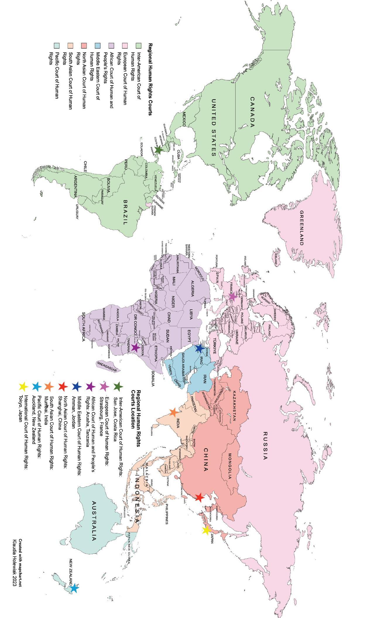 An International Court of Human Rights shall be created and begin hearing cases when 50 countries have ratified IBOR without reservations. The Court shall include one judge from each country that ratifies IBOR. Regional Courts, subject to review by the International Court, and including one judge from each country in the region, shall also be organized through the continued operation of existing Regional Courts and the creation of new ones, as depicted in the map attached to this IBOR document.