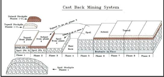 The castback system uses a “tiered” process for backfilling open pits. This places poor quality overburden from pit excavation into the lower third of the previous pits. The upper portion of overburden, removed from the next pit