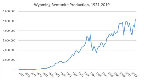 In recent years production history of bentonite reflects the fortunes of its chief use as drilling fluid or “mud” for the energy industry. 5,157,153 tons of bentonite were mined in Wyoming in 2019, an 18 percent increase from 2018. However, with the reduction of oil well drilling in 2019, the cat litter industry has dominated with significant growth in 2019 and 2020.