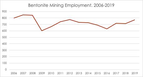 The bentonite industry occupies a small, but important segment of Wyoming’s economy. This is especially true for those rural communities that support the industry in the state. These relatively high-paying jobs are especially crucial to these communities. And the diversity of uses for bentonite means that these are likely more secure jobs than other resource-based industry jobs.