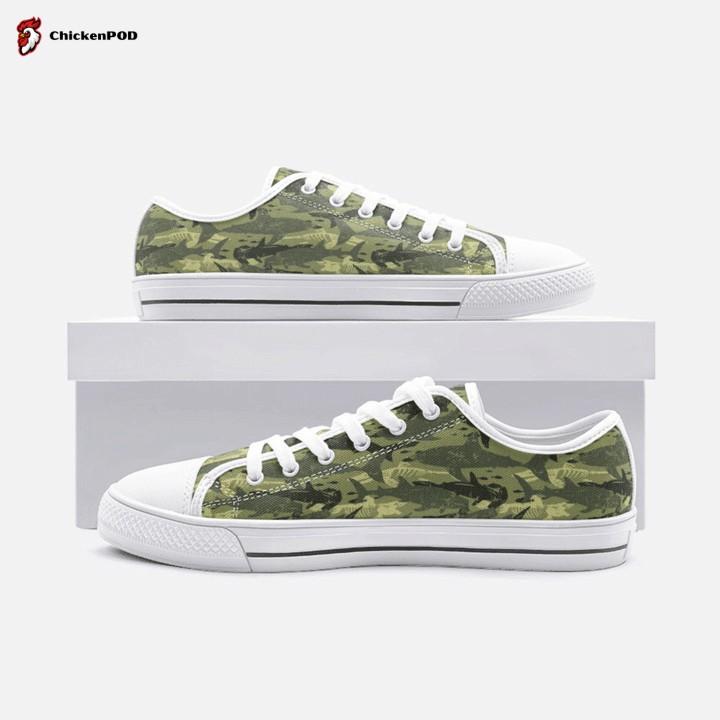 So why settle for ordinary footwear when you can make a bold statement with our Green Camouflage Shark Low Top Shoes?