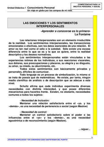 LAS EMOCIONES Y LOS SENTIMIENTOS INTERPERSONALES -Aprender a conocerse es lo primeroLa Fontaine Las relaciones interpersonales son un elemento irreductible de la realidad. Los sentimientos interpersonales, las transacciones emocionales o efectivas, son los datos esenciales de una relación. El amor es tan real como el odio o la soledad. Sólo existe una escasa diferencia entre lo que se es y lo que se quiere, entre la realidad descriptiva y los deseos normativos. Los sentimientos interpersonales están vinculados a las experiencias íntimas de los individuos, a sus reacciones viscerales, sus dolores, sus preocupaciones y placeres, su alegría y su disgusto, su amor, su miedo, su aburrimiento, etc. Todos estos sentimientos son básicamente privados y personales, difíciles de comunicar. Todo lenguaje es un proceso de simbolización, lo mismo si se trata de poesía que de matemáticas. No existe, por tanto, ningún medio científico de análisis o de descripción que se adecue a este nivel. Schultz afirma que cada individuo experimenta diversas necesidades con distinta intensidad, y que posee diferentes mecanismos para hacerles frente. Existen, no obstante, necesidades comunes a todos los sujetos: - Necesidad de Inclusión: Mantener una relación satisfactoria entre el «yo. y los «demás», es una necesidad de pertenencia o social (según Maslow) - Necesidad de control: Mantener un control satisfactorio sobre el poder o las influencias entre el «yo» y los «demás», es una necesidad egocéntrica o de reconocimiento (según Maslow).