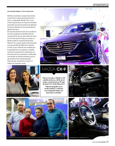 MAZDA CX-9 Única en su tipo, 4 cilindros, 250 caballos de fuerza, 310 lb. pie de torque, sensación de un V8, tipo de motor 2.5 l. turbo Skyactiv-G. Vehículo amigable con el medio ambiente, realizado con terminados hechos con materiales reciclados. IVETTE SALOMÓN Y ERICKA PONCE