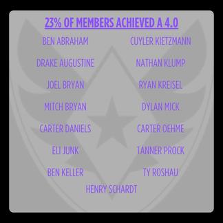 Further setting us apart, our chapter achieved the highest GPA increase among all Fraternity and Sorority Life (FSL) organizations compared to the prior semester Notably, 15 members, including 4 seniors, 4 juniors, 3 sophomores, and 4 freshmen, earned a perfect 4 0 GPA, showcasing the hard work and discipline across all classes To add to this success, no member fell below a 2.0 GPA, a critical factor in yielding these results.