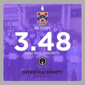 Our chapter is proud to announce an outstanding academic performance this past semester, securing 3rd place among all fraternities at Kansas State with an impressive 3.48 GPA. This accomplishment not only reflects the dedication of our members but, more importantly, highlights our collective focus on putting scholarship first