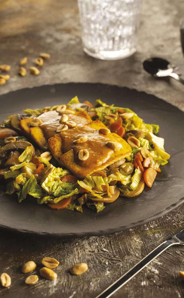 Disporre sul piatto le verdure con sopra il tofu e la salsa come topping.