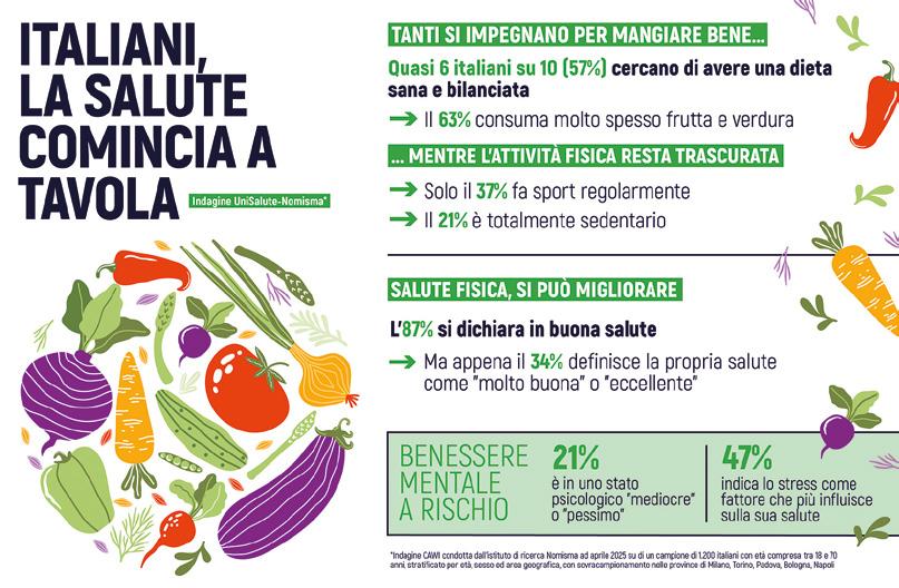 Uno stile di vita equilibrato con la prevenzione mantenendosi attivi e alimentarsi in modo sano; è a quest’ultimo punto che gli italiani prestano più attenzione in fatto di salute, lo dice una ricerca dell’Osservatorio Sanità di UniSalute e Nomisma. Quasi sei su dieci seguono un’alimentazione sana e bilanciata; due su tre consumano frequentemente frutta e verdura. Il 66% evita snack salati, il 47% limita anche i dolci. Resta più difficile rinunciare a