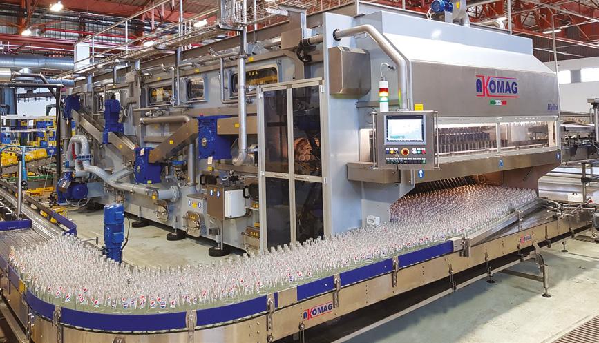 Il lavaggio delle bottiglie è completato con le spruzzature interne ed esterne, che avvengono con detergente ad alta pressione distribuito tramite ugelli rotanti autopulenti e autocentranti. Al completo risciacquo, invece, provvedono una serie di spruzzature (a temperatura decrescente) che accompagnano le bottiglie alla fase di risciacquo finale con acqua di rete. Proprio su questa spruzzatura si è concentrata l’attenzione di Akomag: installando una speciale valvola con flussimetro integrato sulla tubazione di alimentazione (comandata direttamente dal pannello di controllo), è stato possibile rilevare il con-