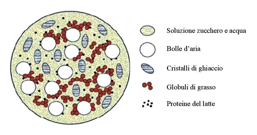 Il gelato non è soltanto un dessert piacevole, ma un vero e proprio sistema alimentare complesso. È formato da cristalli di ghiaccio, globuli di grasso, bolle d’aria e da una parte liquida (chiamata fase sierosa) che contiene zuccheri e polisaccaridi (Homayouni et al., 2018). La consistenza e la qualità del gelato dipendono dall’equilibrio tra queste componenti: ad esempio, la quantità di zucchero presente non determina solo il livello di dolcezza, ma influisce anche sulla temperatura di congelamento e sulla quantità di acqua che si trasforma in ghiaccio. In altre parole, lo zucchero contribuisce direttamente alla cremosità e alla struttura del prodotto finale (Goff, 1997; Marshall et al., 2003) (Fig. 1).