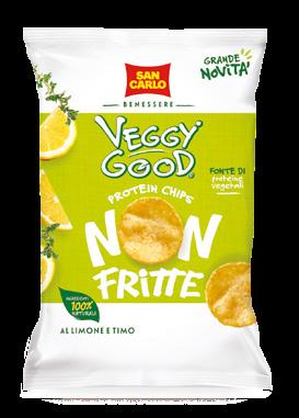 Le Protein Chips si aggiungono alla gamma Veggy Good, che comprende anche Triangolini con Ceci Croccanti, Triangolini Tre Legumi, Triangolini con Mais e Patata Viola e Quadrotto con Carota.