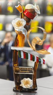 Per la copertina che ha conquistato il massimo gradimento dei lettori della nostra rivista, tanto da vincere il concorso “Vota la Copertina 2025”, il soggetto è opera di Carmela Moffa che ha voluto creare una boccetta di profumo a base di mousse al cioccolato bianco e vaniglia, cremoso passion fruit e mango, dacquoise al cocco e brunoise di mango, passion, banana e lime. Una volta abbattuta, viene nebulizzata con Velly Spray, che dà colore ed effetto velluto. La pompetta è in cioccolato bianco, così come la fascetta esterna con placchetta. A rifinire, il colorante in polvere scintillante oro diluito con alcol. Il premio “Vota la Copertina” è stato istituito nel 2009 per promuovere la creatività aziendale e i voti assegnati online vengono raccolti attraverso pasticceriainternazionale.it e i canali social della testata. Ad ogni edizione i conteggi indicano l’apprezzamento di interlocutori che, del prodotto illustrato, amano anche valutarne l’immagine, scegliendo quella ai loro occhi più efficace. Rinnoviamo dunque sin d’ora l’invito, come sempre, ad esprimere il proprio