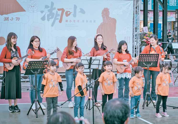 去年湖小建校 70 年,陳校長又以《成長 的甘甜》,寫下:「大山跤,太湖邊,咱的 笑聲滿山墘。父母望咱出頭天,親像秋月圓 圓圓。先生的教示斟酌聽,若 啊日頭綴咱 行,步步共咱惜命命,燒烙咱的心頭定。蜜 蜂採蜜汗那流,蚼蟻扛米攢過年,著趁少年 愈拍拚,才會愈有好名聲。盡力學習日迵暝, 健康成長滿九年。春風吹,雨水滴,向陽的 花蕊笑微微。飽仁的蘆黍滇滇滇,收成的滋 味甜甜甜。」歌詞句句寫下湖小 70 的喜悅和 成長的歡欣,陳校長用他的心血春風化雨、 築夢踏實。