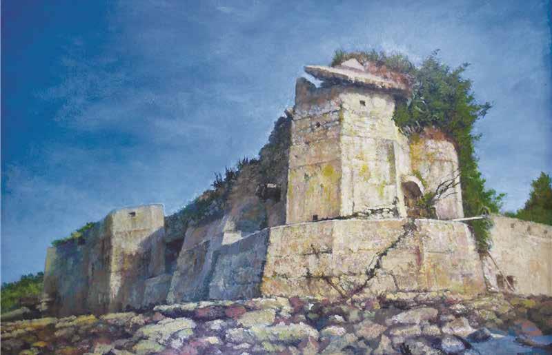 主,以浯鄉風情為題的風獅爺、燕尾馬背古 厝、洋樓建築、殘垣斷壁風土,長期沉潛藝