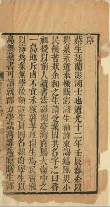 開澎進士蔡廷蘭(1801-1859),原 名崇文,字仲章、後改名廷蘭、更字香祖, 號郁園,學者稱秋園先生,祖籍瓊林,出生 於澎湖林投澳雙頭掛社,曾於廈門玉屏書 院跟著興泉永兵備道周凱讀書,道光 26 年 (1846)甲辰科進士,曾於臺南引心書院、 崇文書院教書,歷任江西峽江、豐城知縣,