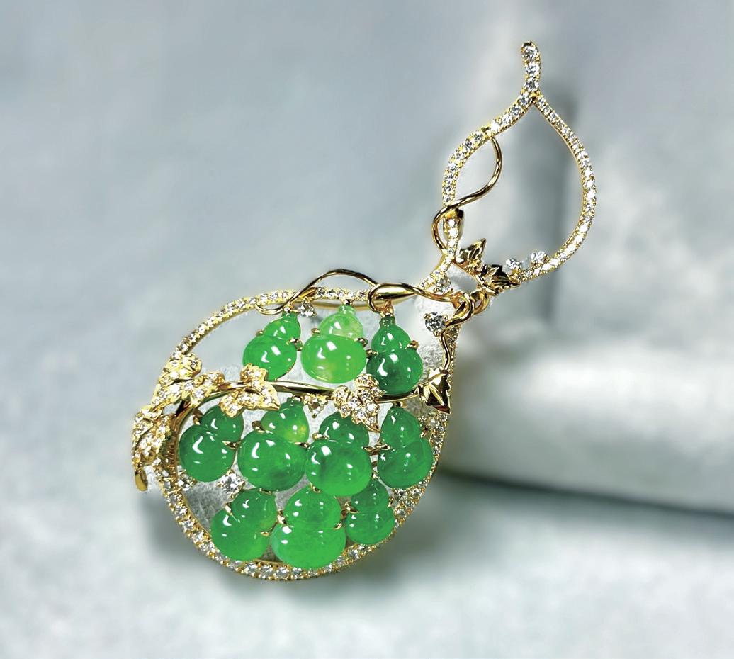 翡翠作品,以溫潤玉質巧雕多子葫蘆,展現盧老師將傳統媒材賦予現 代美感的匠心獨運。
