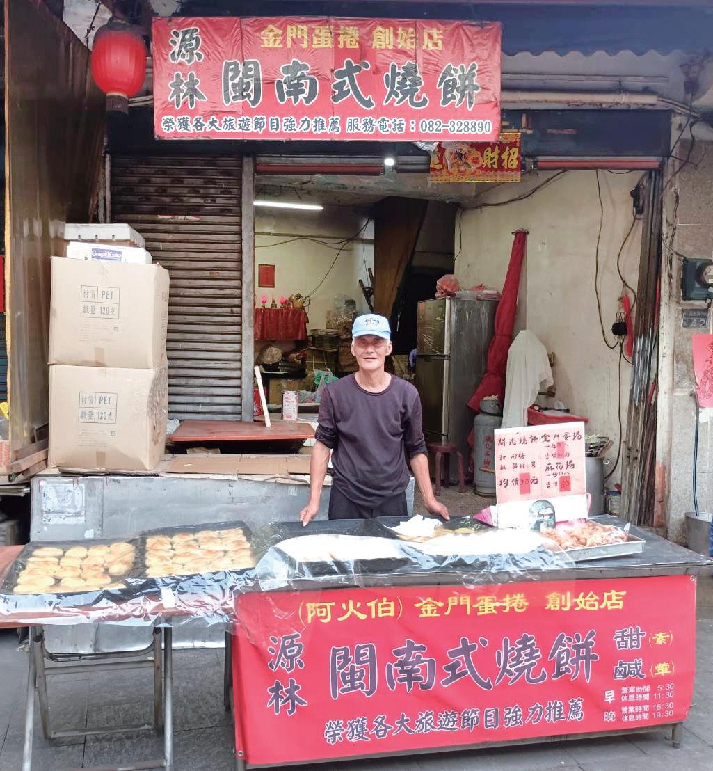 當您漫步於金門金城鎮的莒光路,行至邱良功母節孝坊旁 的街角時,一股融合著炭火與蛋香的獨特氣息便會悄然瀰 漫,勾引著過路人的目光與味蕾。在這座素以戰地風情與 自然景觀聞名的小島上,便藏著這樣一家低調卻又香氣四 溢的老店「源林閩南式燒餅 & 金門蛋捲」,默默守護著屬 於金門的庶民味覺記憶,傳遞著跨越三代、飄香逾一甲子 的職人精神與深厚文化情感。