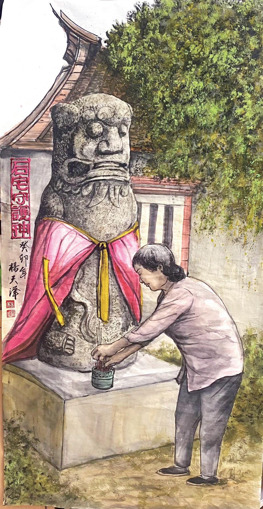 「我們湖下老家旁(近湖埔國小處)原 有一尊風獅爺。1949 年時,有部隊為拓寬道 路將其損壞,此後村內便事故頻傳。我的祖 父於心不忍,於是邀請匠師修復風獅爺。說 也奇妙,此後村裡不僅多添男丁,也培育出 不少事業有成的賢達,如董事長、公務人員、 教師等,提升了整體的社經地位。每年農曆 8 月 15 日風獅爺聖誕,我都會回湖下老家祭 拜,也曾為祂重新彩繪過。」談及以水彩描 繪風獅爺的因緣,楊天澤老師認為這段童年 記憶是重要的啟蒙。