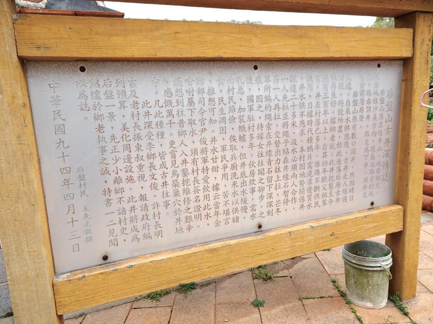 這口承載著無數記憶的古井,後來在時 任金寧鄉鄉長李文俊先生、前任村長王振東 先生以及現任村長許明吉先生等人的共同關 注與努力下,成功爭取到政府預算,進行了 周邊環境的整建,使其煥然一新,成為后盤 山的一處特色景點。村民們更特請本文作者 王先正老師撰寫〈后盤山古井深情誌〉,並 設立解說牌,如今常吸引遊客駐足探訪,細 讀古井的悠悠來歷。