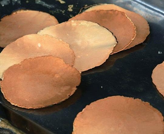 店裡的蛋捲堅持全程手工製作, 從選蛋、調製粉漿、燒燃柴火,到控 制模具溫度,每一個步驟都需憑藉經 驗精準掌握時間與火候。師傅以特製 的剪刀狀鑄鐵模具夾取適量麵糊,將 總重約 4.5 公斤(9 市斤)的 5 個模 具,依序置於柴火上輪流翻烤。每片 蛋捲的厚薄與焦色,皆因手工掌控火 候的細微差異而各具風情,也因此更 顯個性與手作的溫度。