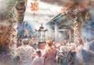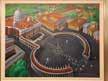 以壓克力顏料重現其壯麗神韻。畫面採鳥瞰構圖, 宏偉穹頂與廣場弧形廊柱層層展開,透視精準而 深遠。周圍樹影與建築色彩相互呼應,使畫面主 次分明。整體筆觸沉穩而富節奏,在光影與空間 之間,流露出一種莊嚴而寧靜的藝術氣息。
