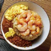 那碗獲得「500碗」殊榮的「蝦皇蝦多多飯」, 是他對料理最極致的追求:白蝦去殼去腸泥,只 取彈牙鮮段;醬料與蝦膏醬則是全自製的祕方, 攜裹著若有似無的炭火香,貼附在每一粒米上。