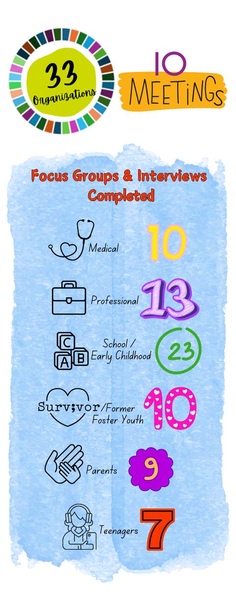 In addition, using a human-centered design approach, we are incorporating the voices and perspectives of stakeholders who have had personal experience with child abuse. From February through June of this year, research interviews have been conducted with 72 participants. This included meeting with survivors of child abuse, parents, school and daycare staff, medical personnel, professionals who work in the field of child welfare, and high school students. We asked them about their experiences and what could have been done to prevent abuse from occurring. The purpose of this research is to learn about what resources, support, and information would be helpful in preventing abuse and neglect. We have begun to look for trends and key themes in the data that will help us understand which areas need to be the focus for further work.