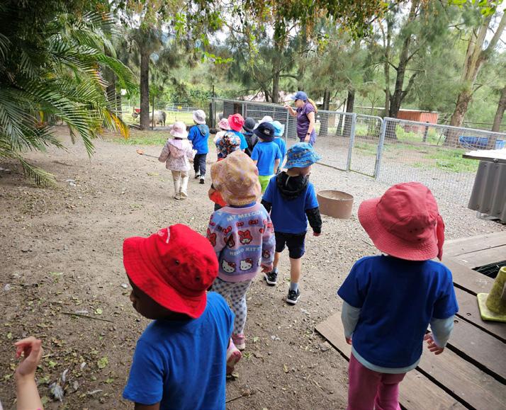 The excitement began with a bus ride to the farm, where the friendly staff warmly welcomed us. After a quick morning tea, our children were divided into color-coded groups and set off to explore with the effervescent and informative farm tour guides. The farm came alive with the sounds of our very excited children as they met a variety of gorgeous animals. They patted some cheeky alpacas, observed hens laying eggs, and marvelled at beautiful horses, sweet donkeys, cute sheep, darling guineapigs and rabbits, and giant piggies. Our highlight was the tractor ride through the gardens, where we all learned about growing food for the animals.