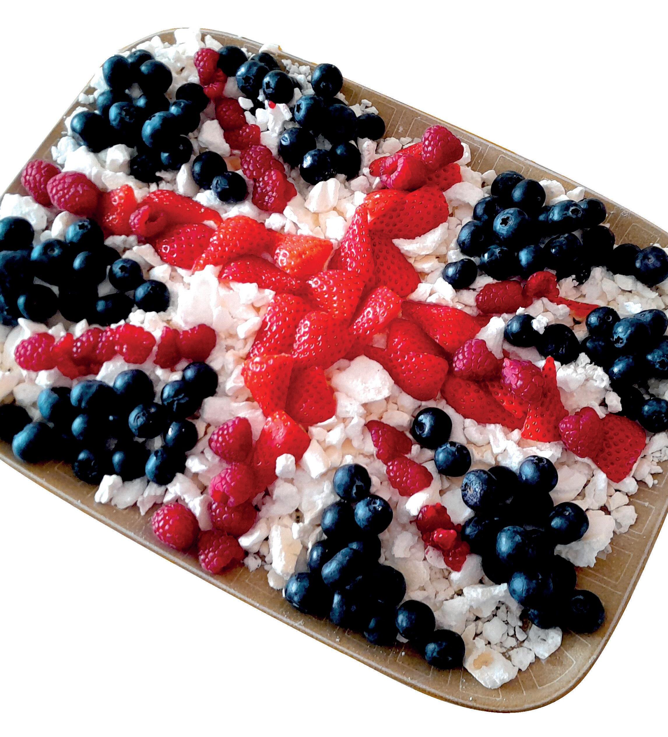 2. Arrange the fruit on a square or rectangular plate or tray to make the shape of the Union Flag using blueberries for the blue, raspberries and strawberries for the red and mini meringues or meringue pieces for the white.