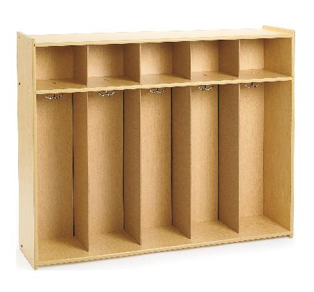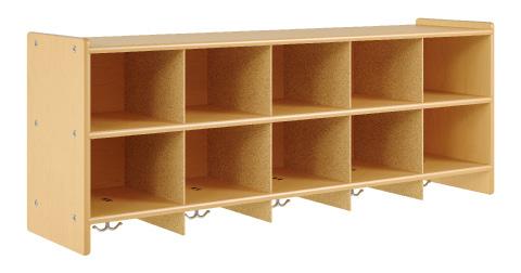 Smaller storage areas measure 11”l x 3”h, and larger storage areas measure 11”l x 18”h. Comes with 10 coat hooks and 10 3-12”w x 2-1/2” h name plates.