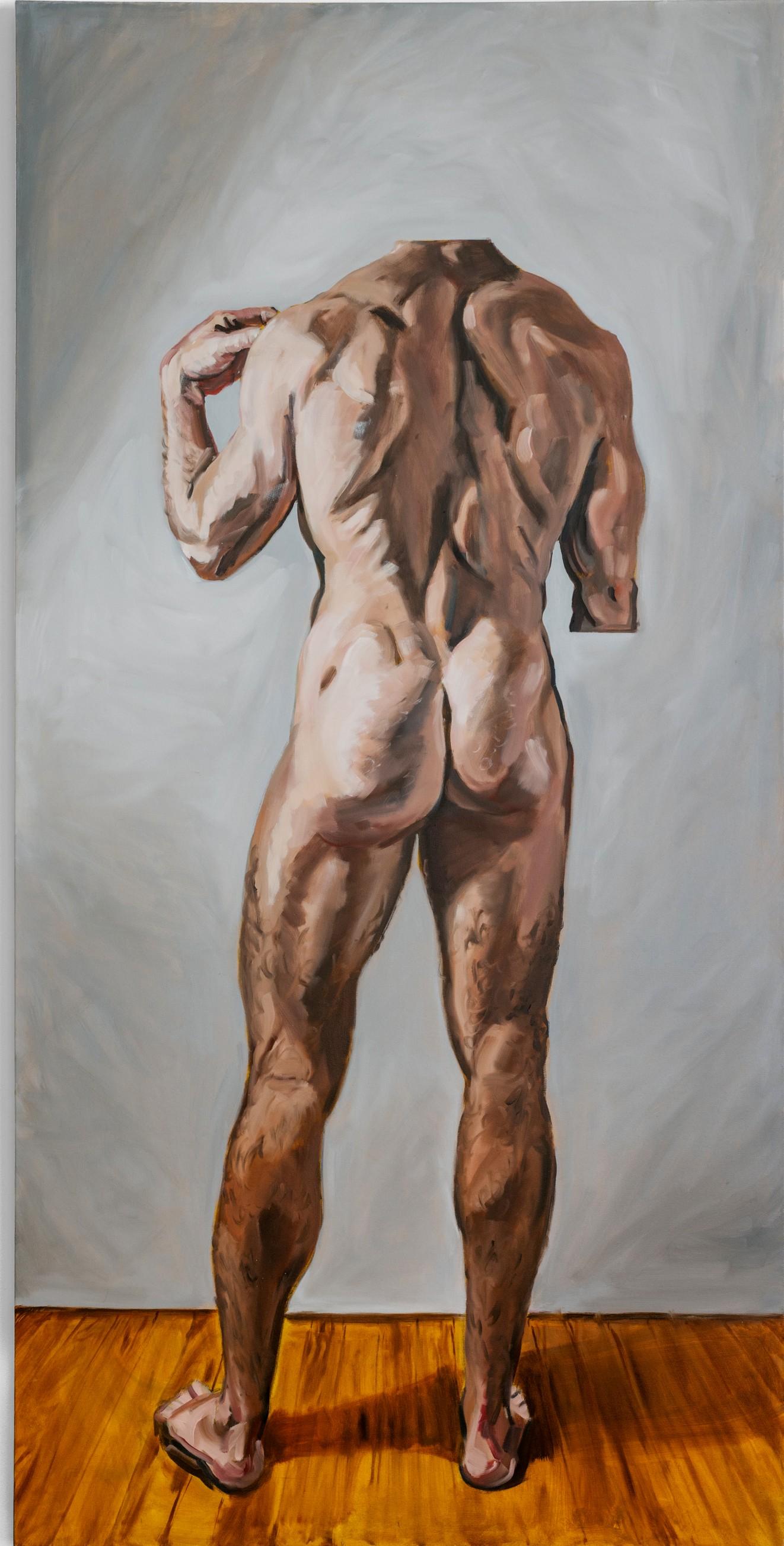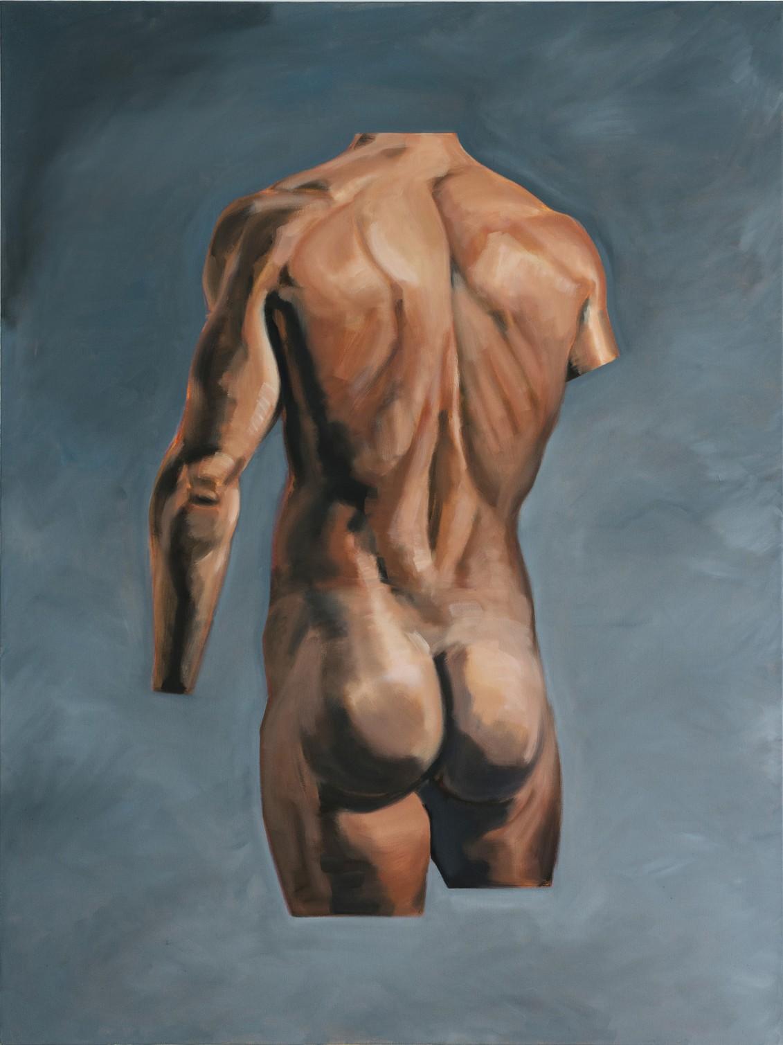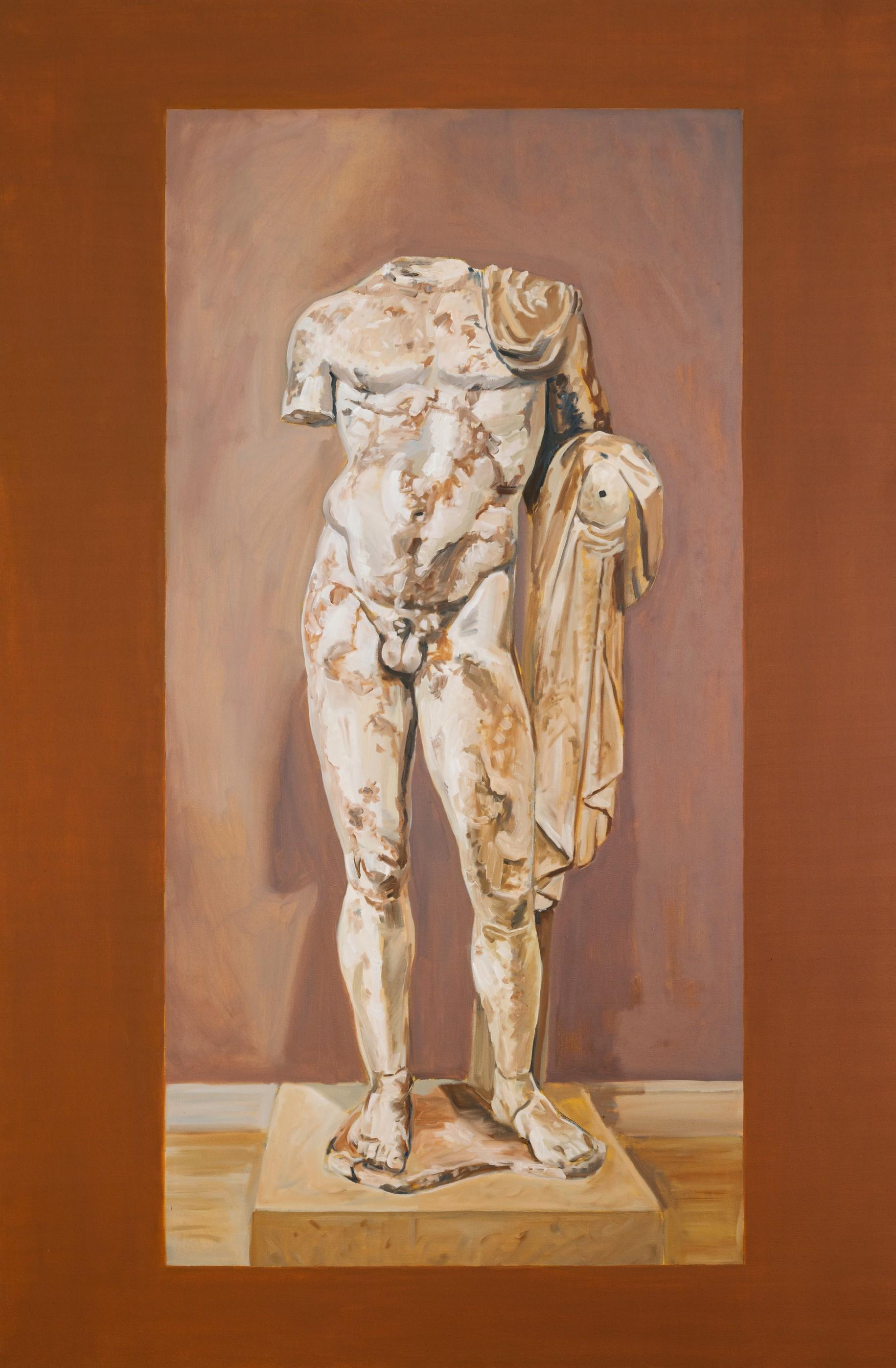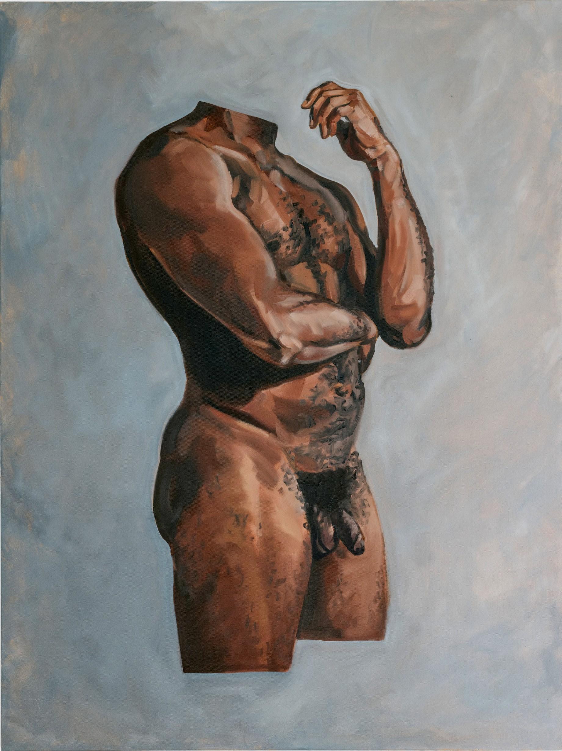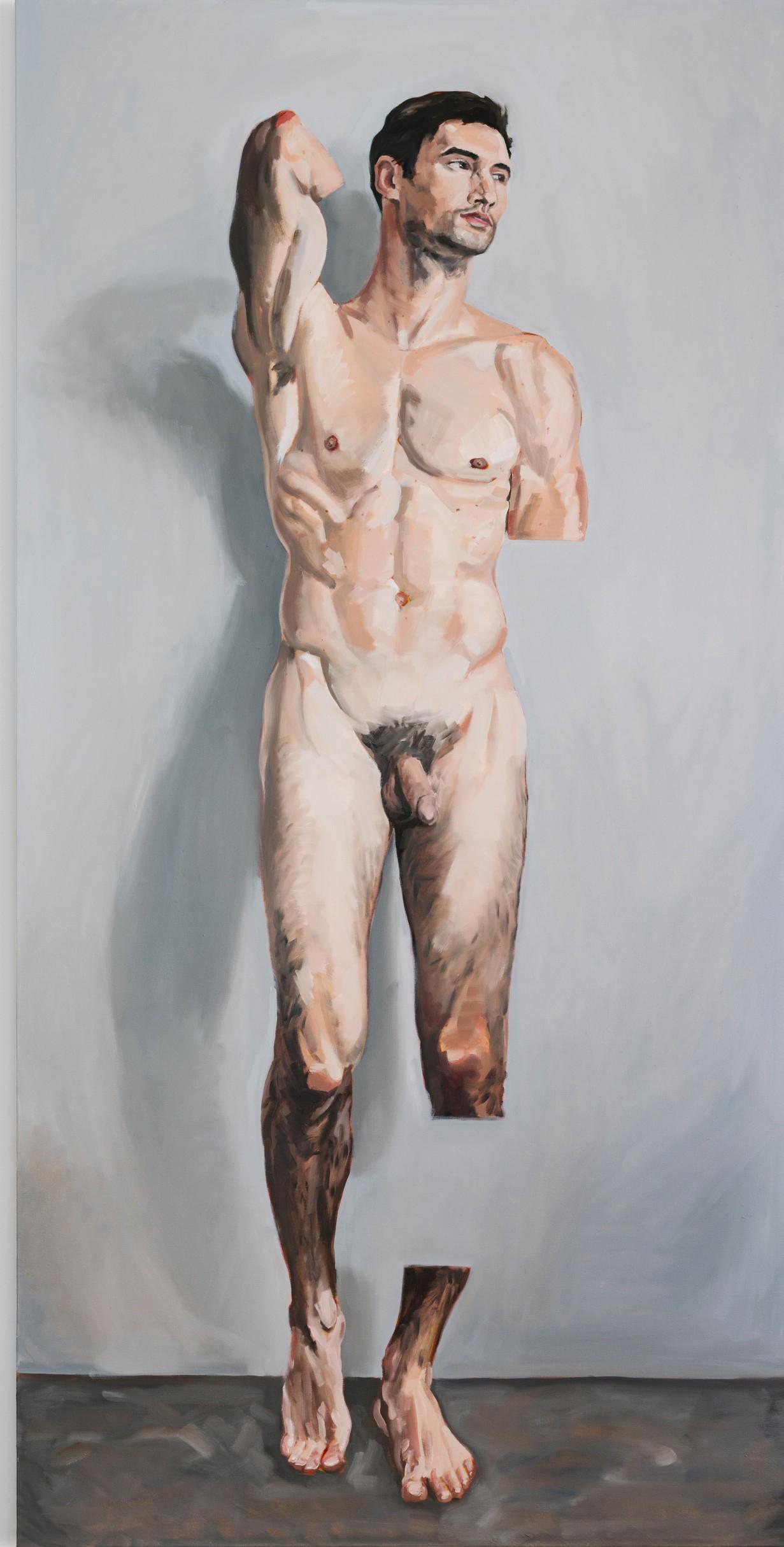 Left: Late-Hellenistic sculpture from the monument to Daochos, 2022. Oil on canvas, 72 x 48 in. $15,000.Though inherent to a very modern medium, these ideas are paralleled in ancient statuaryGreek sculpture being particularly infamous for its insistence upon bodily perfection. The Classical period of Greek art developed an aesthetic based upon a set canon of proportions for the human form and the belief in the virtue of beauty – that one’s outer looks are intrinsically tied to their inner morals. The Classical portrait thus displayed balance and harmony through idealization and the renouncement of realistic characterization, creating an aspirational visual tool for contemporaneous Greeks, and a representation of the body that continues to be influential to this day, with particular resonance in the gay community.
