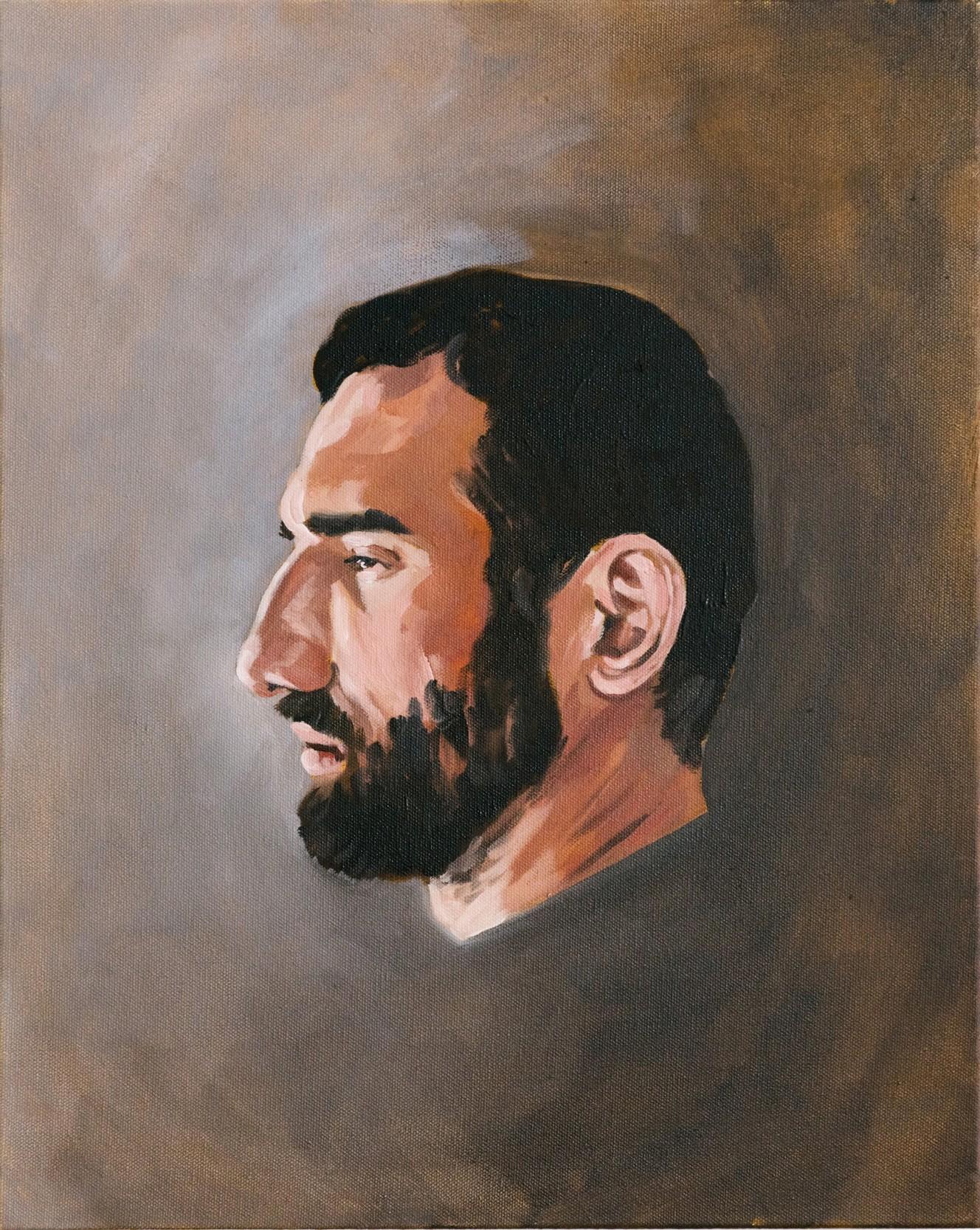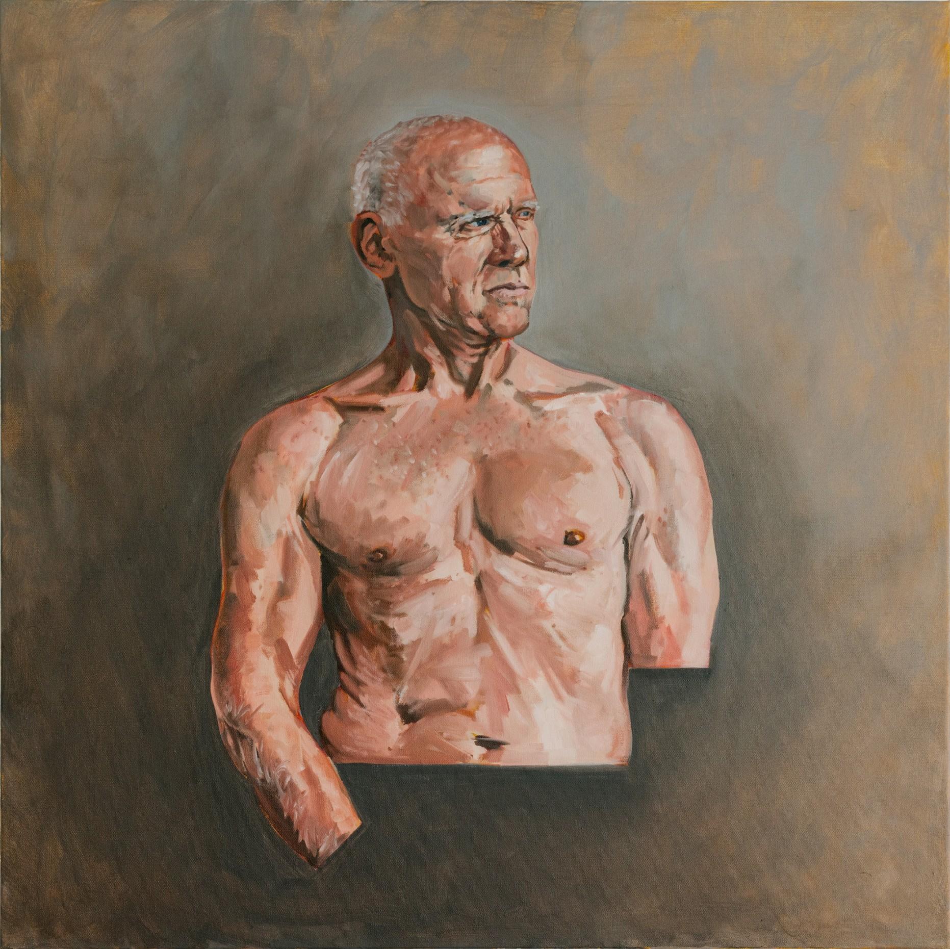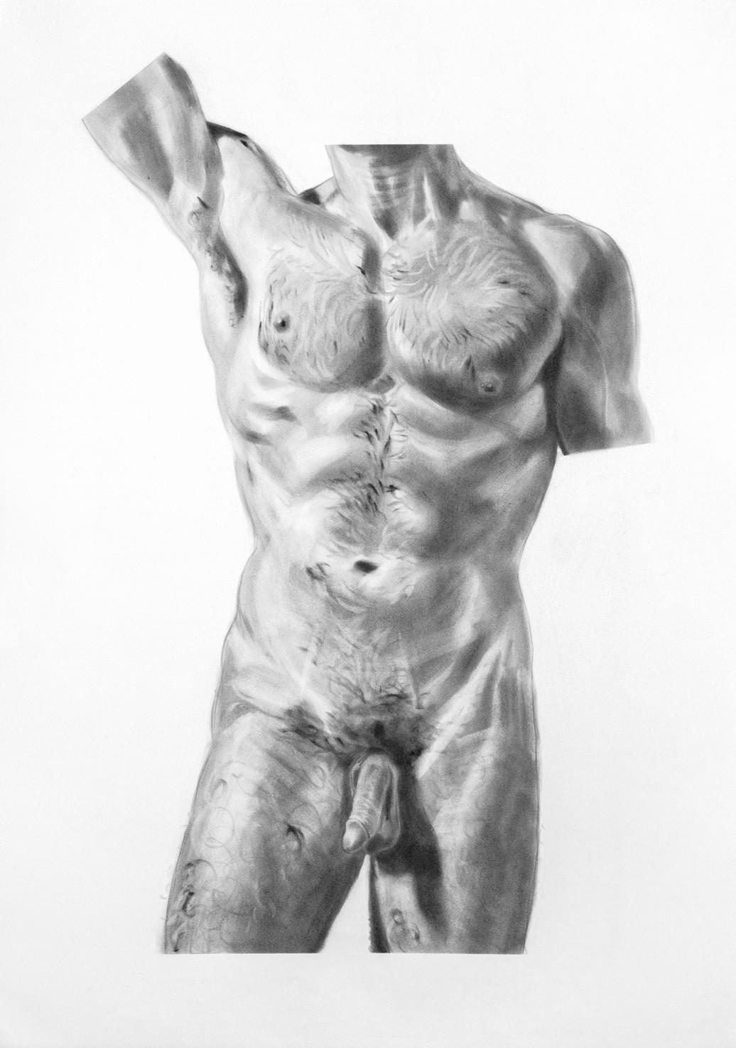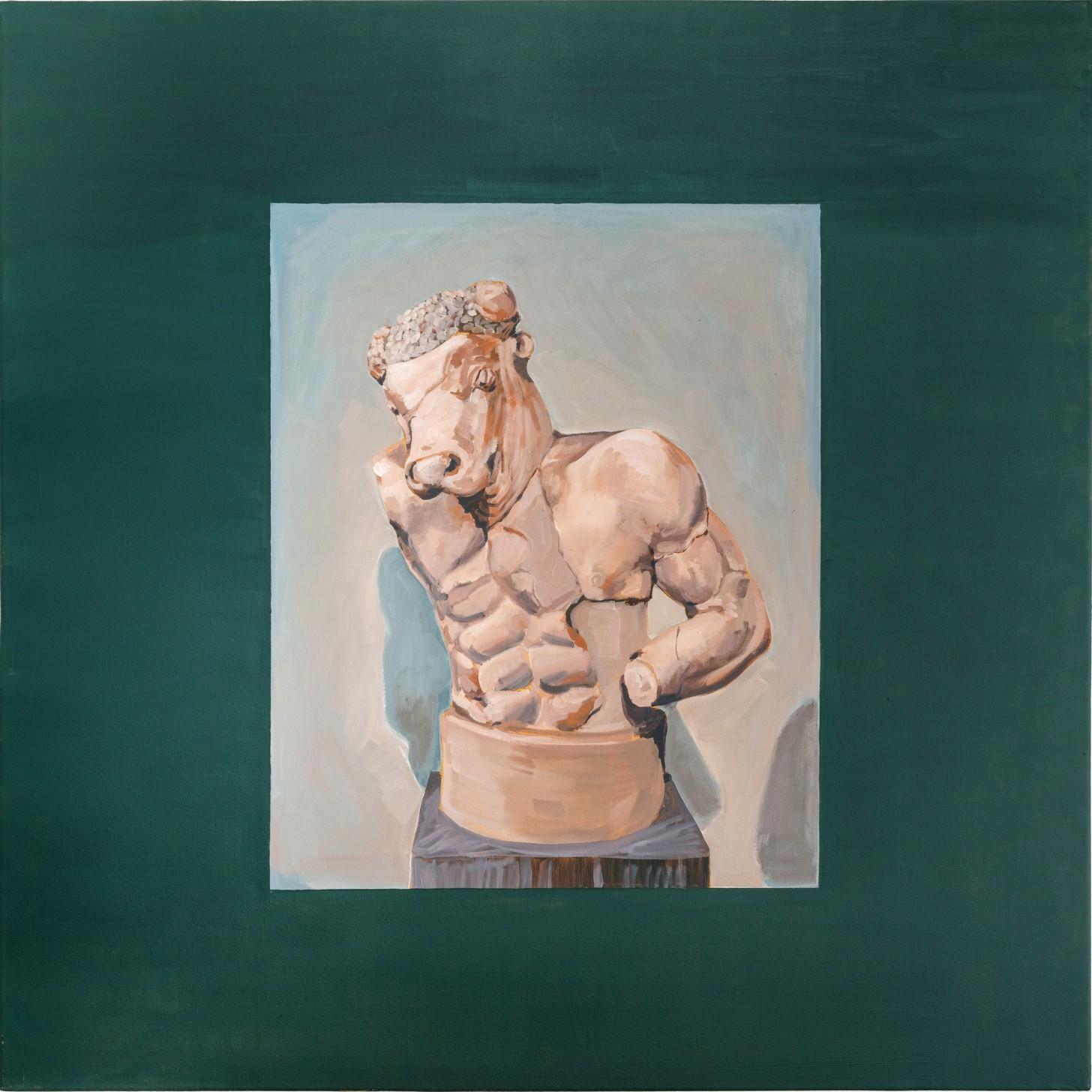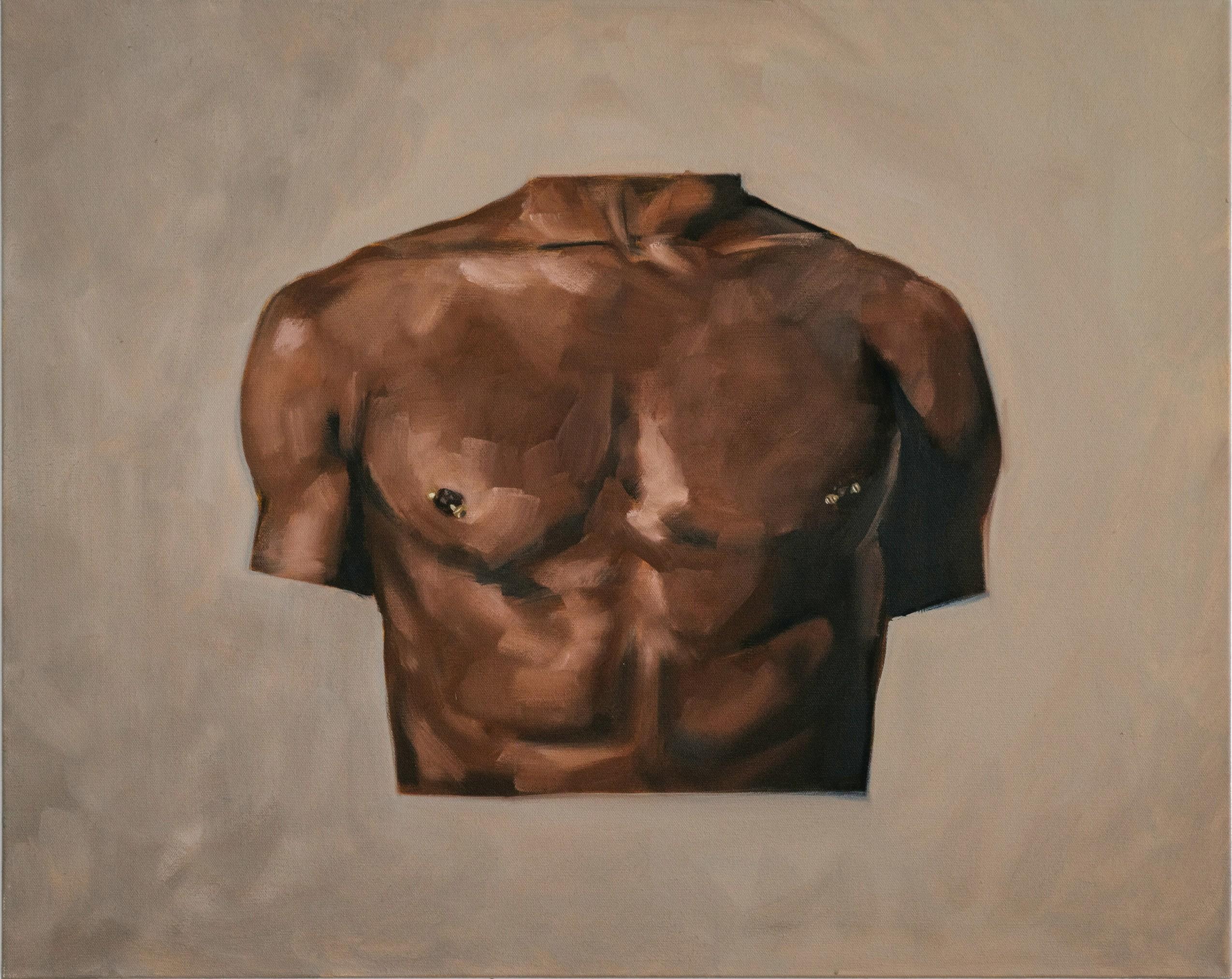 Left: Late-Hellenistic sculpture from the monument to Daochos, 2022. Oil on canvas, 72 x 48 in. $15,000.Though inherent to a very modern medium, these ideas are paralleled in ancient statuaryGreek sculpture being particularly infamous for its insistence upon bodily perfection. The Classical period of Greek art developed an aesthetic based upon a set canon of proportions for the human form and the belief in the virtue of beauty – that one’s outer looks are intrinsically tied to their inner morals. The Classical portrait thus displayed balance and harmony through idealization and the renouncement of realistic characterization, creating an aspirational visual tool for contemporaneous Greeks, and a representation of the body that continues to be influential to this day, with particular resonance in the gay community.