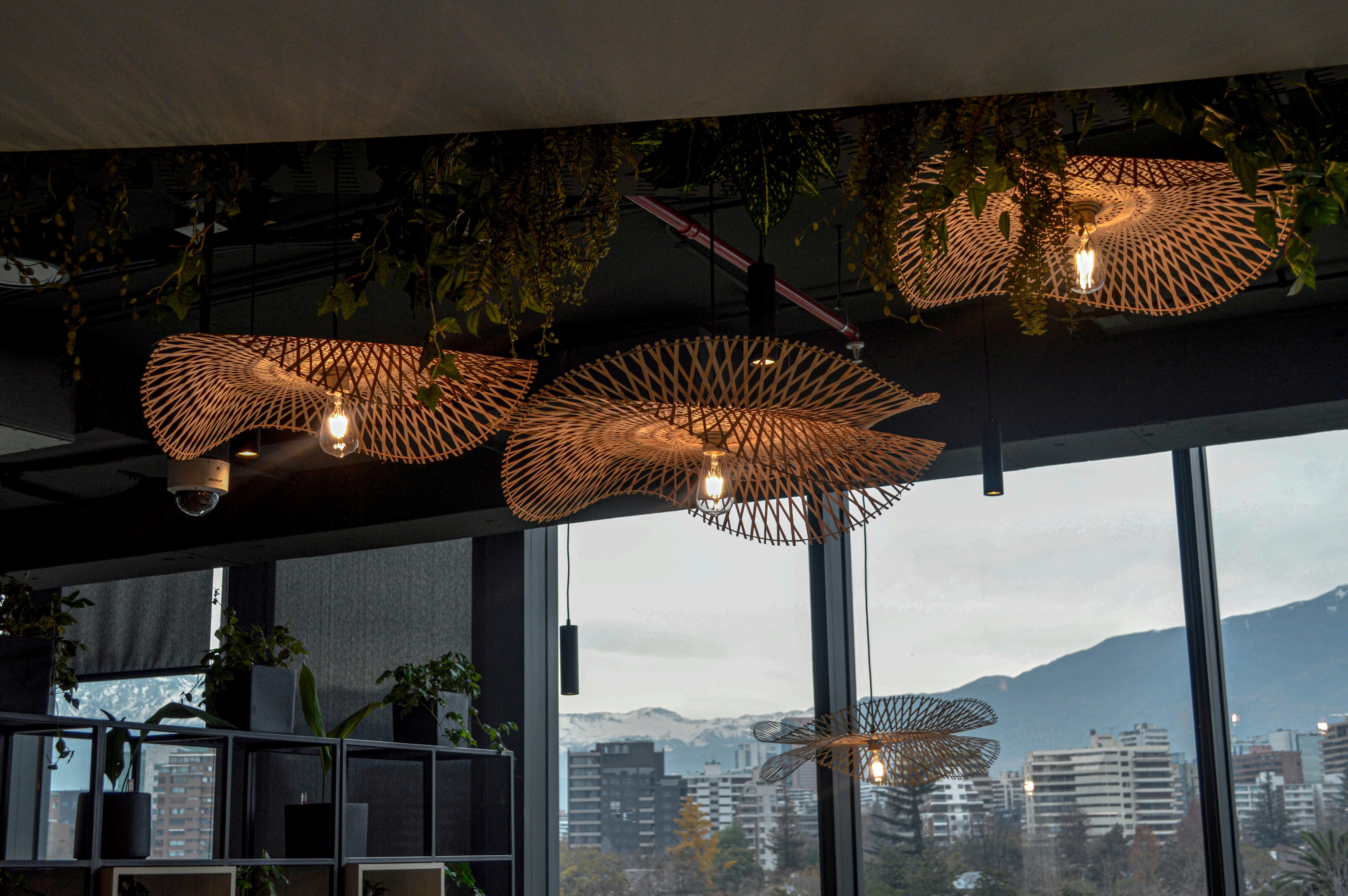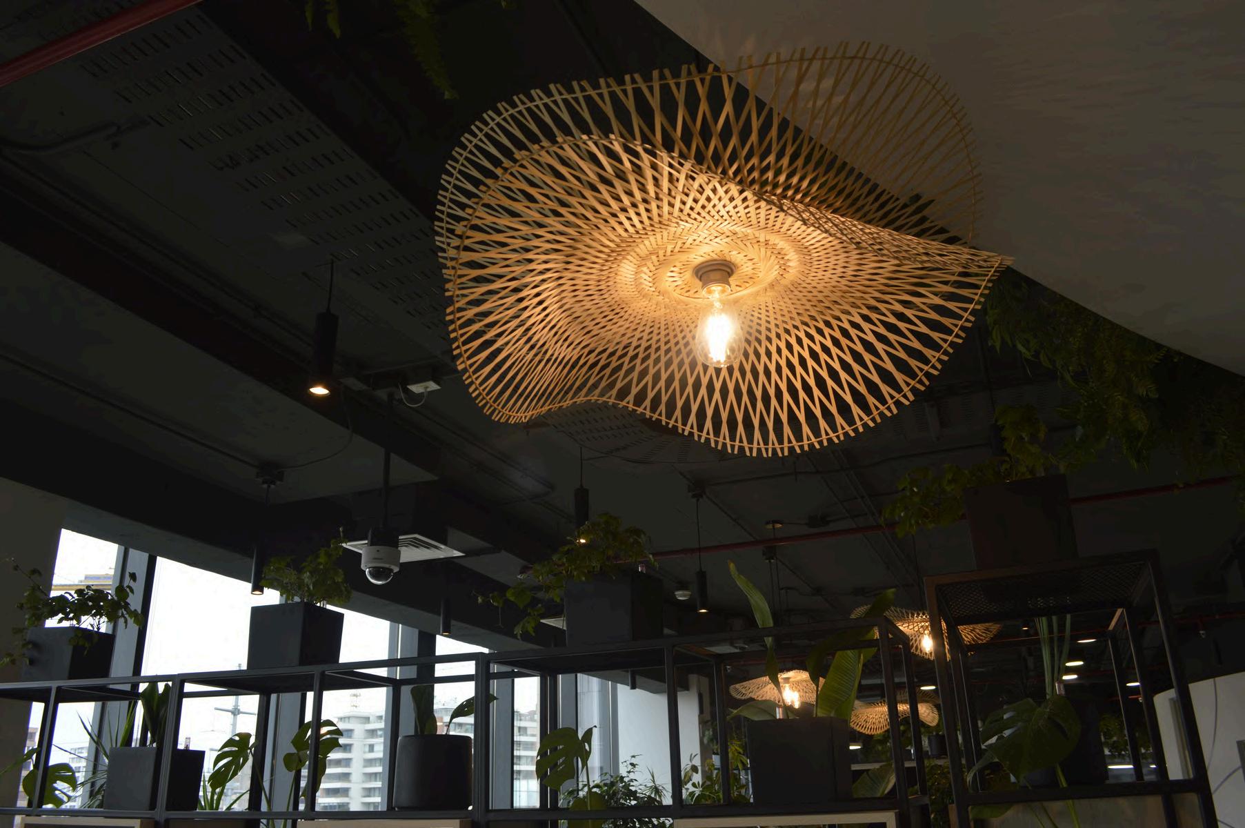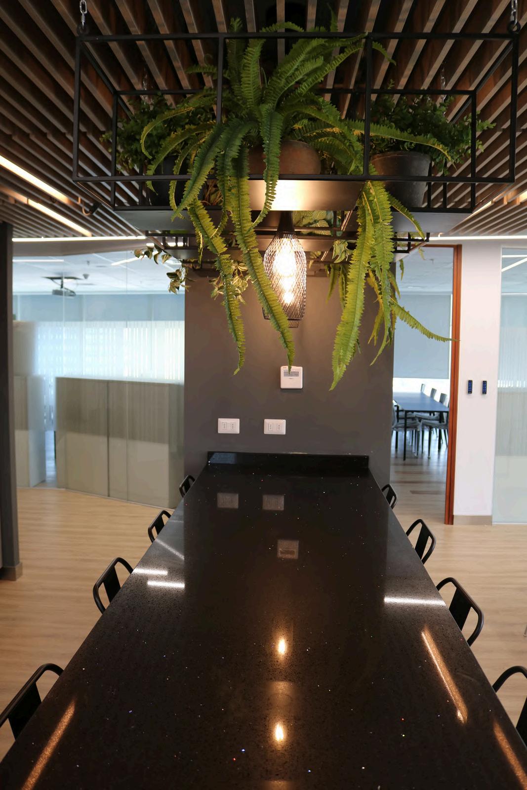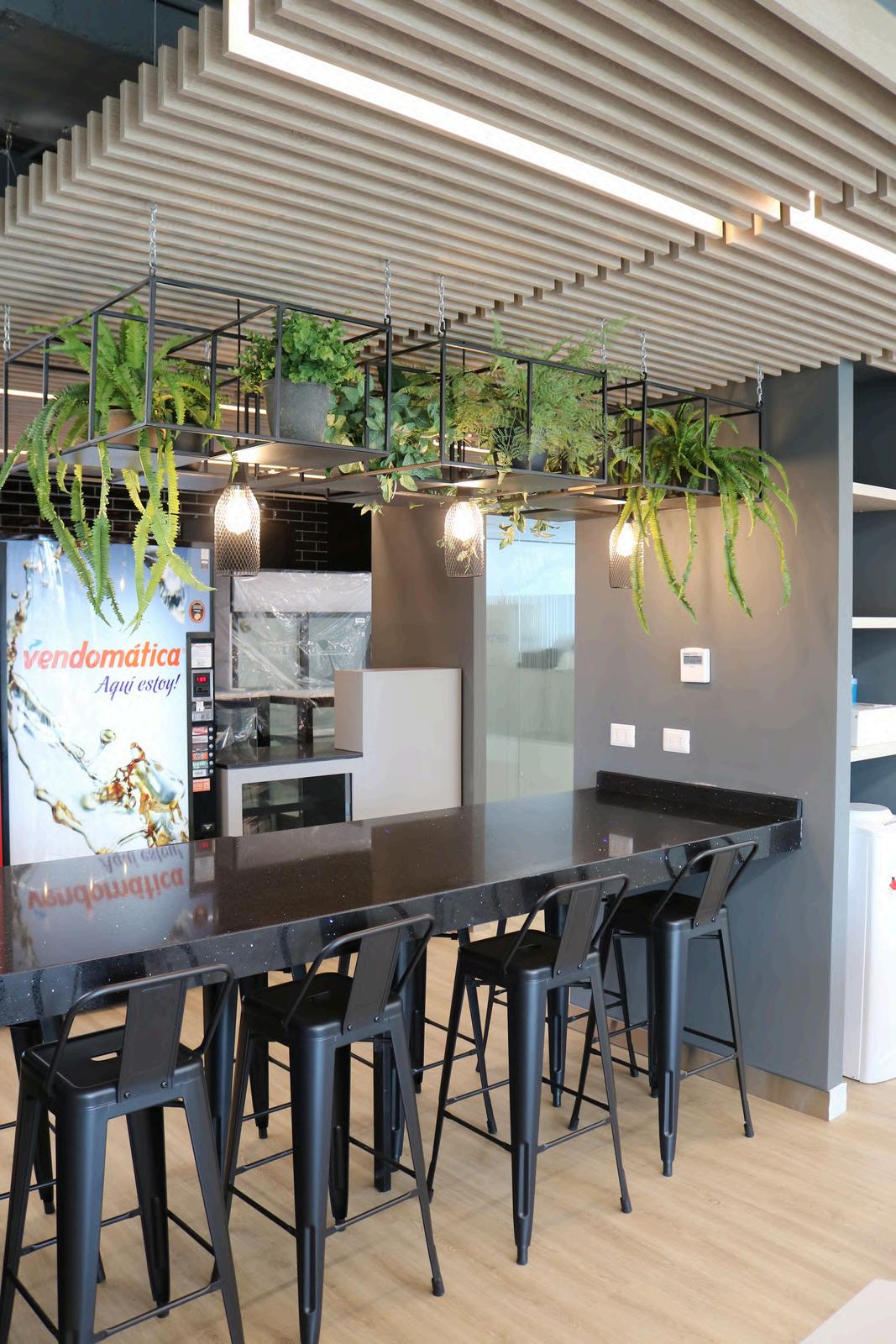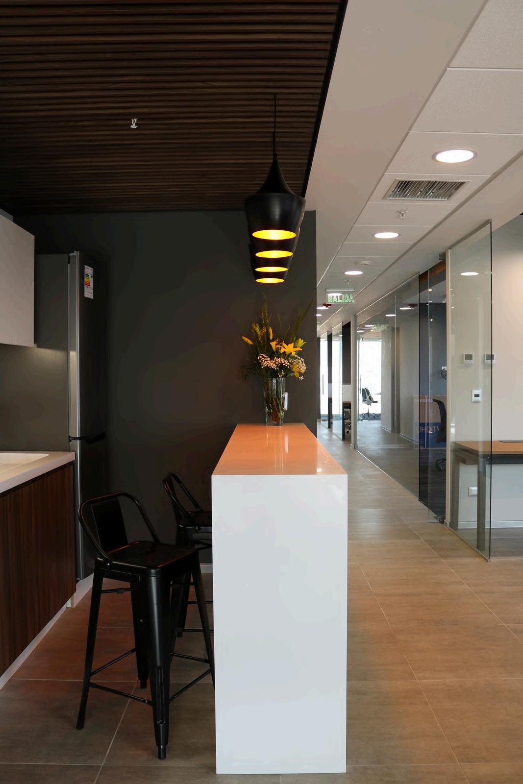 Se colocó en el cielo palillaje, creando un cielo raso con un diseño único. Los palillos de madera natural aportan calidez y textura al ambiente, y además ayudan a mejorar la acústica de la oficina.
