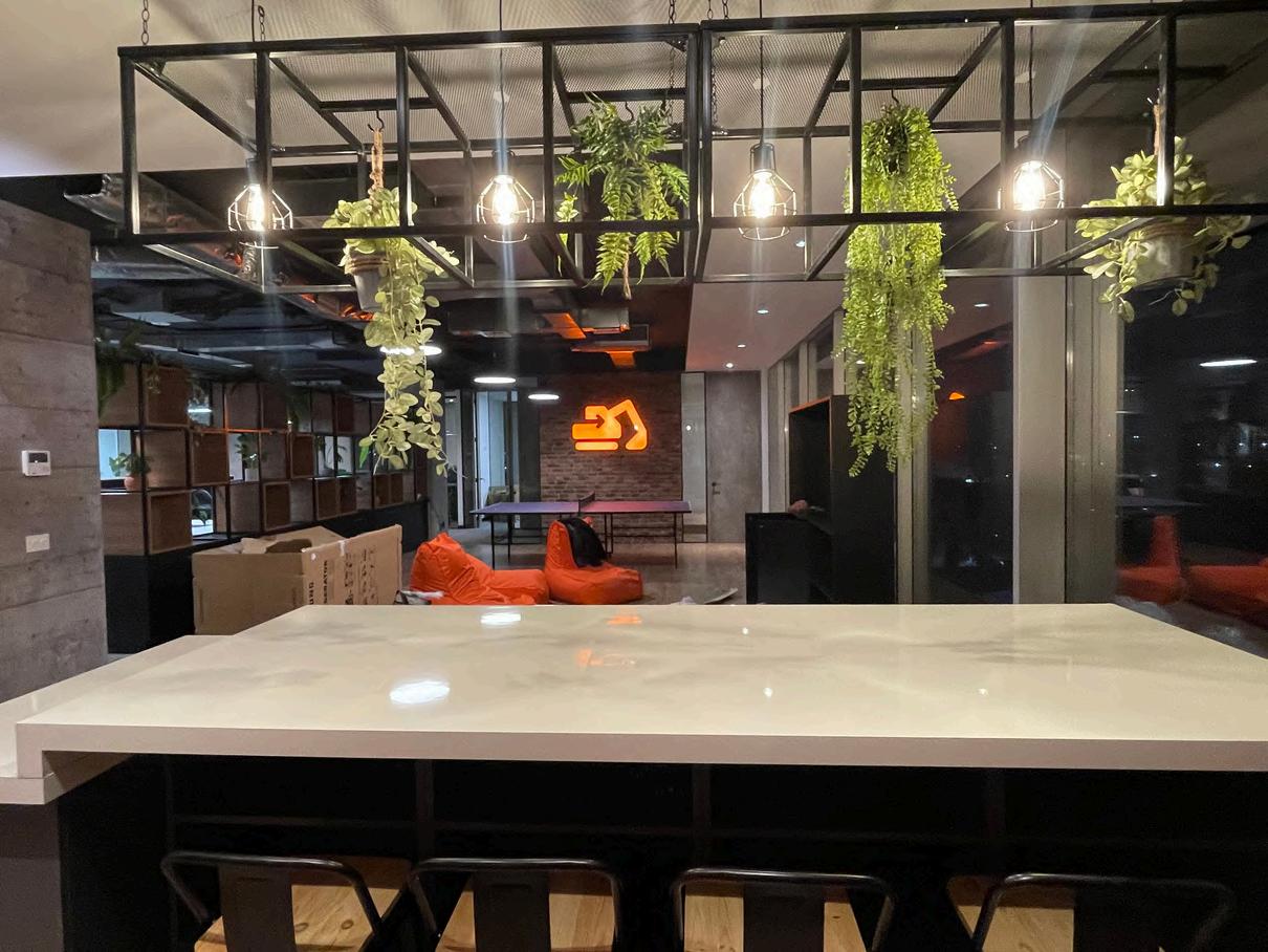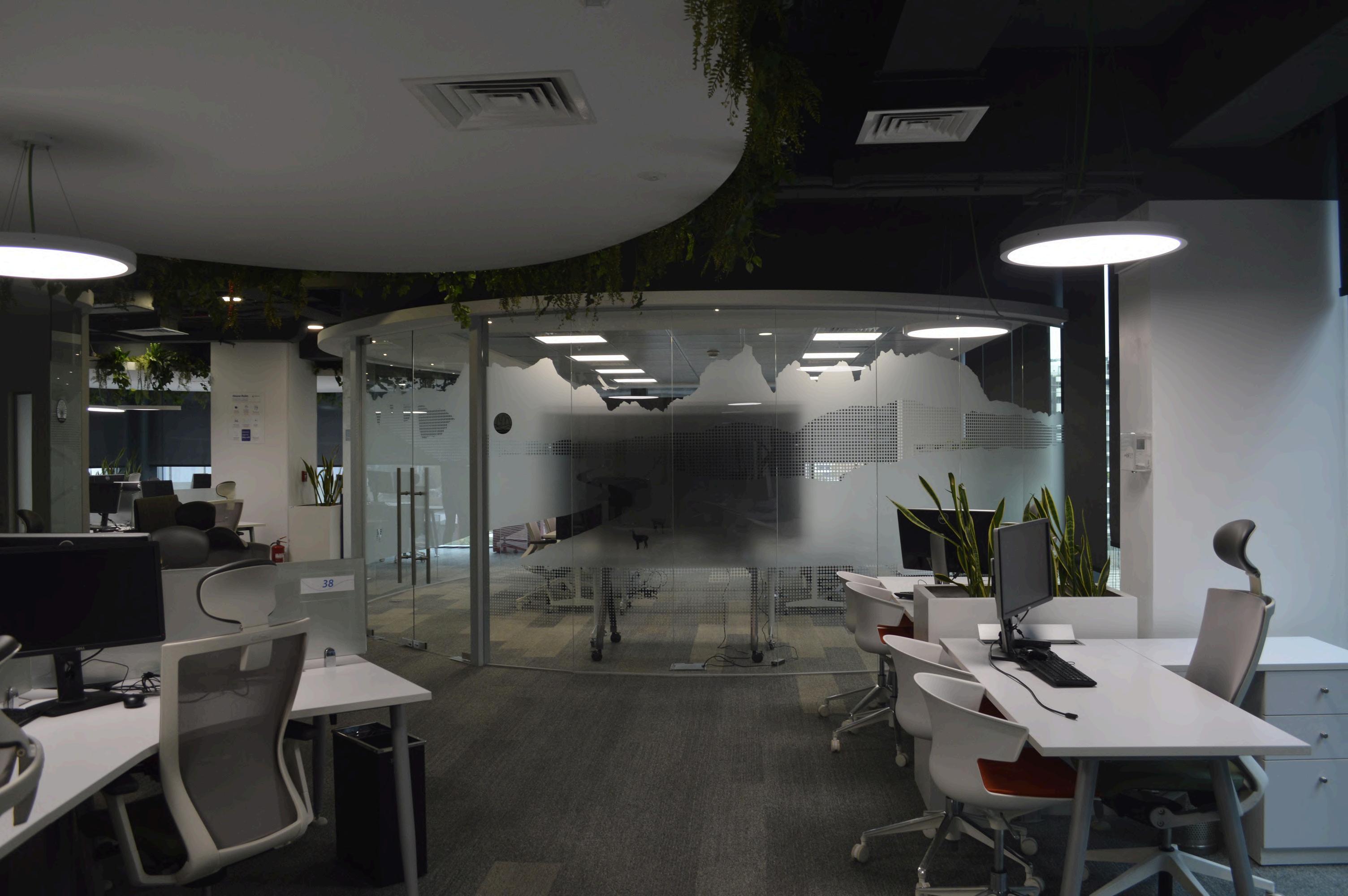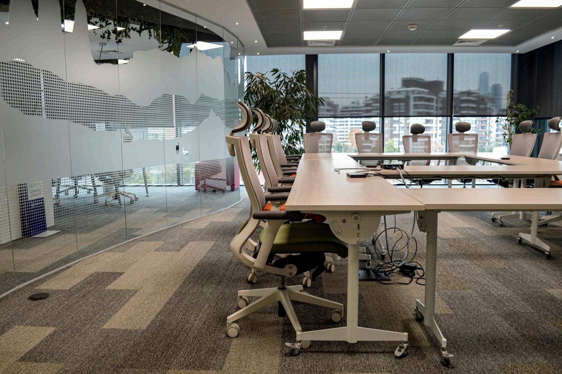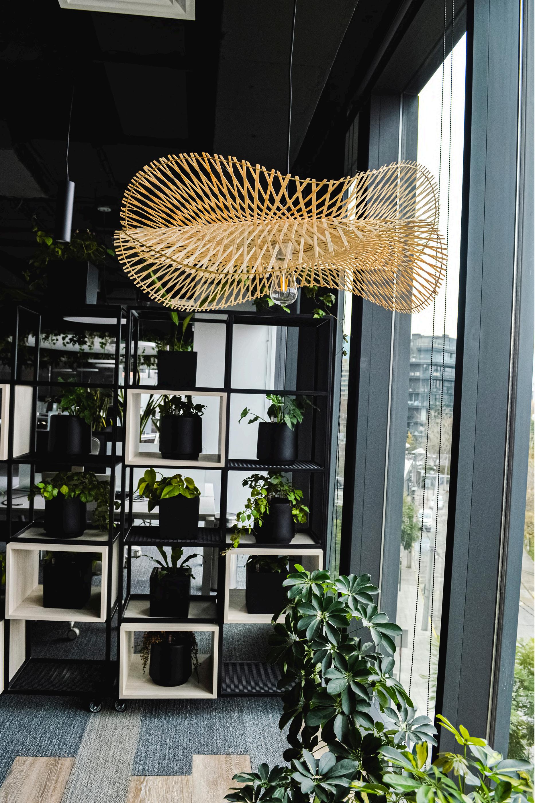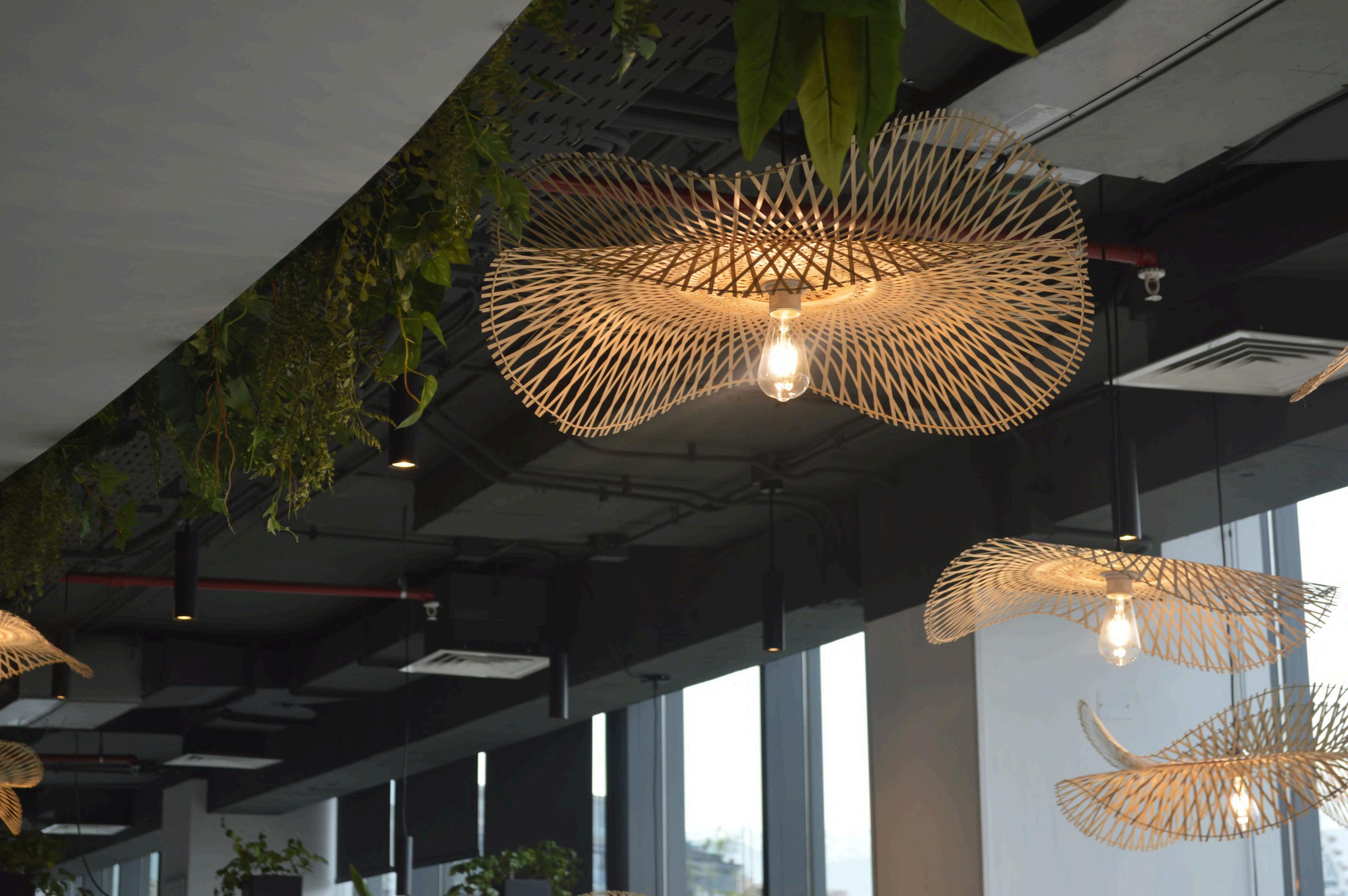 Se colocó en el cielo palillaje, creando un cielo raso con un diseño único. Los palillos de madera natural aportan calidez y textura al ambiente, y además ayudan a mejorar la acústica de la oficina.