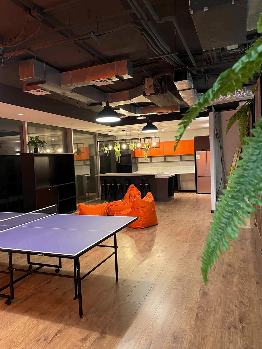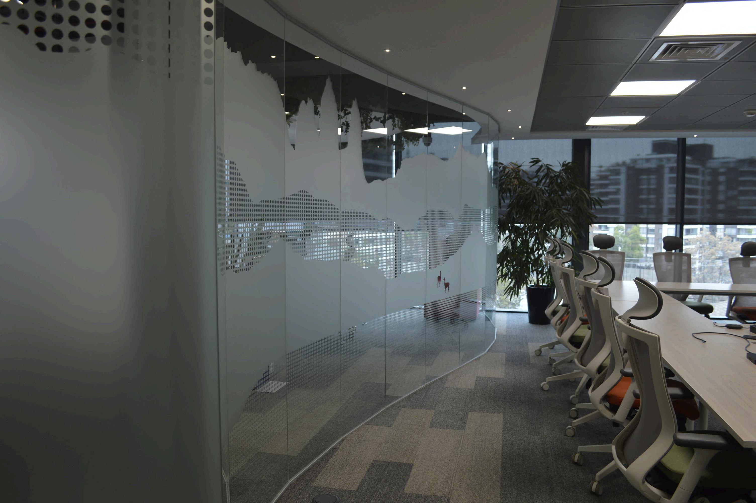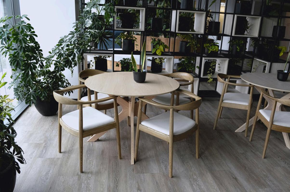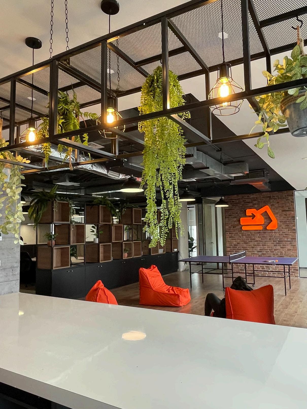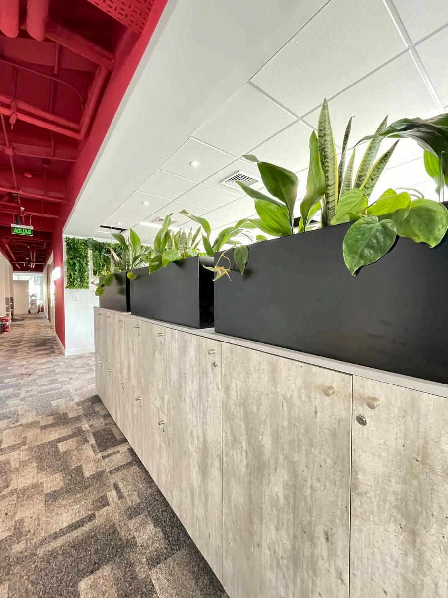 Se colocó en el cielo palillaje, creando un cielo raso con un diseño único. Los palillos de madera natural aportan calidez y textura al ambiente, y además ayudan a mejorar la acústica de la oficina.