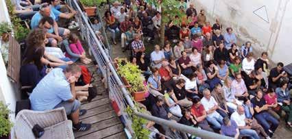 Das Holzpodest ist ein großartiger Ort für kleine Konzerte: mitten im Grünen, gut sichtbar und erreichbar, aber dennoch angenehm abgeschirmt vom direkten Wohnumfeld. Technisch bringt es Herausforderungen mit sich: Der nächste Stromanschluss ist rund 15 Meter entfernt, das Wasser ist nicht trinkbar.
