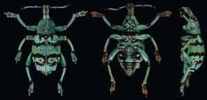 Der Freiburger Nature Photographer kam „durch Zufall in den Besitz einer Käfersammlung“. Und fand die sechsbeinigen, geflügelten und mit Kopffühlern ausgestatteten Präparate so schön, dass er sie in verschiedenen Positionen fotografierte. Aus den sehr detaillierten Aufnahmen montierte er mit der ziemlich komplizierten Technik der Makrofotografie dann die Bilder, die im 3. Obergeschoss ausgestellt sind. „Mosaike aus vielen Einzelbildern, die zusammen ein großes Bild ergeben“, beschreibt er seine Werke, die wie barocke Stillleben anmuten. Wie die in leuchtenden Farben geheimnisvoll schillernden Krabbler und Flieger wirklich aussehen, offenbart sich Besucher·innen in einer Vitrine am Eingang zur Ausstellung. Dort sind alle als Fotomodelle dienenden Originalpräparate versammelt –in Originalgröße und weder durch Facettenaugen noch durch moderne