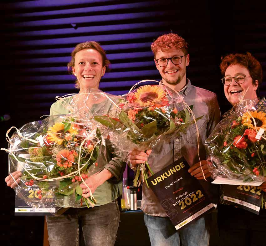Am Ende regnete es Konfetti. Das Publikum im gut gefüllten Jazzhaus klatschte überschwänglich. Als „Freiburgs beste Lehrer*innen“ sind Daniel Volaric und Teresa Ehret ausgezeichnet worden. Volaric unterrichtet am Meret Oppenheim Schul zentrum in Steinen. Ehret ist Lehrerin an der Emil Thoma Grundschule Freiburg. Einen Sonderpreis gab es erstmals für die beste Schulleitung: Die Auszeichnung ging an Marianne Jöllenbeck vom Wentzinger Gym nasium in Freiburg. Mit mehr als 40 Einsendungen hatten sie ihre Kolleg*innen nominiert.