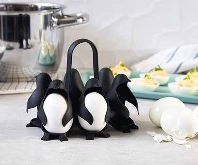 Bis zu sechs Eier von Größe S bis L finden zwischen den flexiblen Pinguin-Flügeln Platz: zur Aufbewahrung im Kühlschrank oder zum Kochen im Topf. Der lustige Eierhalter kann befüllt ins kochende Wasser getaucht werden. Sind die Eier gar, kommen sie direkt auf den Tisch. Die Egguins im stylischen Pinguin-Look machen bei jedem Frühstück eine gute Figur. Der praktische Eierhalter hat einen Hitze-isolierenden Griff und kann in die Spülmaschine.