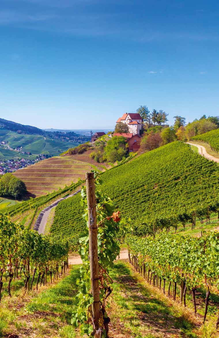 t a l ›› Rund 250 Winzer und Winzerinnen bewirtschaften im Durbachtal in der Ortenau 460 Hektar Rebfläche. 170 Hektar sind dem Riesling vorbehalten, der hier „Klingelberger“ heißt. Er hat seinen Namen von einem Teil des Schlossbergs, wo Markgraf Carl Friedrich von Baden 1782 mit dem sortenreinen RieslingAnbau begann. Auf der Terrasse von Schloss Staufenberg kann man heute mit einem edlen Tropfen den herrlichen Ausblick ins nahe Elsass genießen.