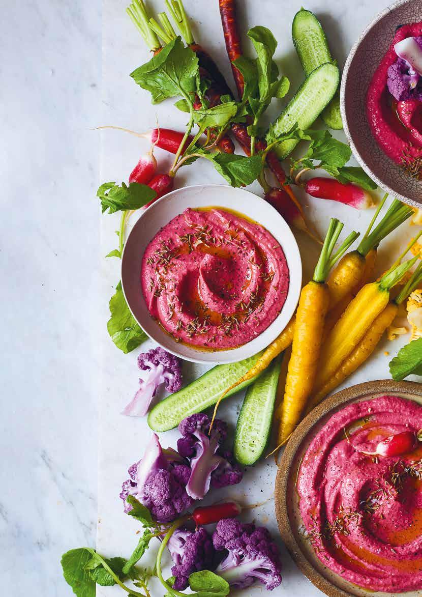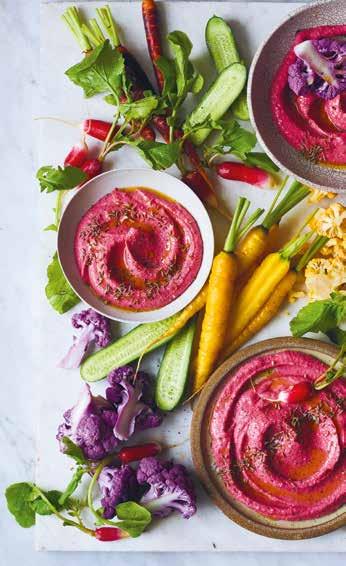Kichererbsen, Rote Bete, Tahini, Zitronensaft, die Hälfte des Kreuzkümmels und die Hälfte des Olivenöls im Mixer (Blitzhacker) zu einer glatten, cremigen Masse pürieren. Abschmecken.