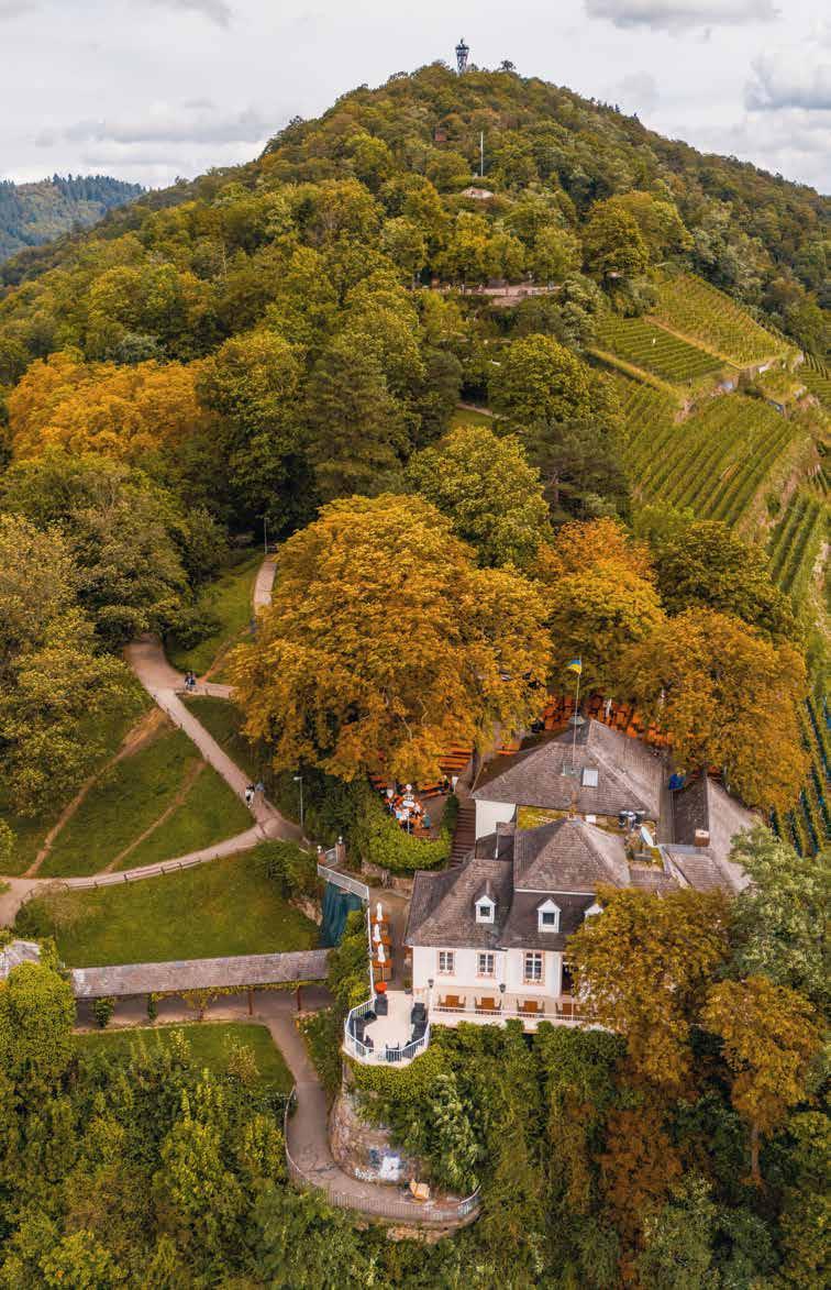 hinter dem Totenkopf das Markgräflerland mit den Schwarzwaldbergen Belchen und Blauen. Im Norden Laub- und Nadelwälder. Und nach Westen blicken wir in den inneren Kaiserstuhl mit seinen Wäldern, sanften Kuppen und Weinbergen – ein weiteres Wow! Tief unten liegt Alt-Vogtsburg mit dem Kirchlein St. Romanus.