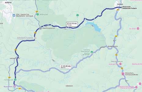 38 Meter langen, freitragenden und von einem Schindeldach überspannten hölzernen Brücke über die Murg. Allein die Überquerung des Flusses, der von Baiersbronn kommend dem Rhein zustrebt, ist ein besonderes Erlebnis: Das 1778 erbaute Viadukt ist ein großartiges Zeugnis uralter Zimmermannskunst. Zwar wurde es in den 1960er-Jahren runderneuert und verbreitert, jedoch exakt mit allen historischen handwerklichen Details nach den originalen Plänen rekonstruiert. Kurz verweilen und staunen ist also angemessen.