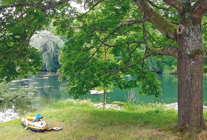 Sich treiben lassen. Von beiden Uferseiten aus breiten die Bäume ihre Äste weit über das Wasser und legen ein schützendes Blätterdach über die Kanufahrer. Bis auf ein leises Plätschern ist es still geworden, auch die Gespräche, die zu Beginn der Tour von Boot zu Boot angeregt hin- und hergingen, sind verstummt und haben dem puren Erleben Raum gemacht. Durch den Einsatz der Paddel kämen die Kanus schneller voran, aber dies ist ja nicht das Ziel dieser Tour. Im Gegenteil, Entschleunigung ist angesagt. So schaukeln die Boote im ersten Streckenabschnitt oft antriebs- und steuerlos über den dichten Teppich aus Wasserpflanzen. Dazu sind keine AbenteurerGene nötig, lässt doch die geringe Geschwindigkeit ein rechtzeitiges Eingreifen zu, wenn das Gefährt zu sehr abdriften sollte. Stellenweise ist aber dennoch Konzentration gefragt. Das Hochwasser im Frühling hat etliche Bäume an der Strecke entwurzelt, die nun an einigen Stellen auch über den Flusslauf ragen und die Durchfahrt behindern.