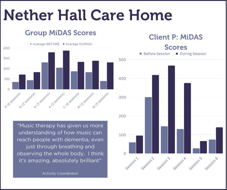 The validated Music Therapy in Dementia Assessment Scale (MiDAS) was used as a tool to quantify the changes observed in sessions, this uses a Visual Analogue Scale to score 5 categories: Interest, Response, Initiation, Involvement and Enjoyment. Scoring reviews Before (in the first 5 minutes of the session) and During (in the best 5 minutes of the session). Scoring was completed jointly by the Music Therapist and activities co-ordinator.