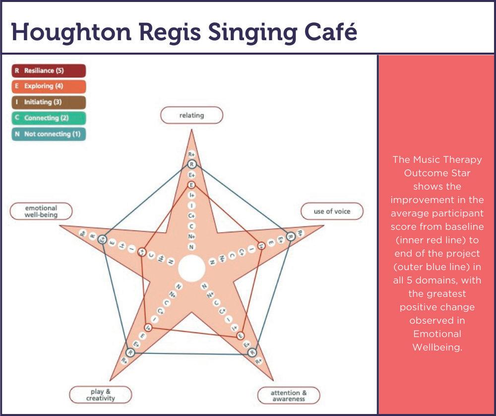 The Houghton Regis Singing Café is a weekly singing group focussed on the wellbeing of older adults who are isolated and those who have a diagnosis of early-mid stages of dementia. Participants are referred into the group by Social Prescribing Link Workers.