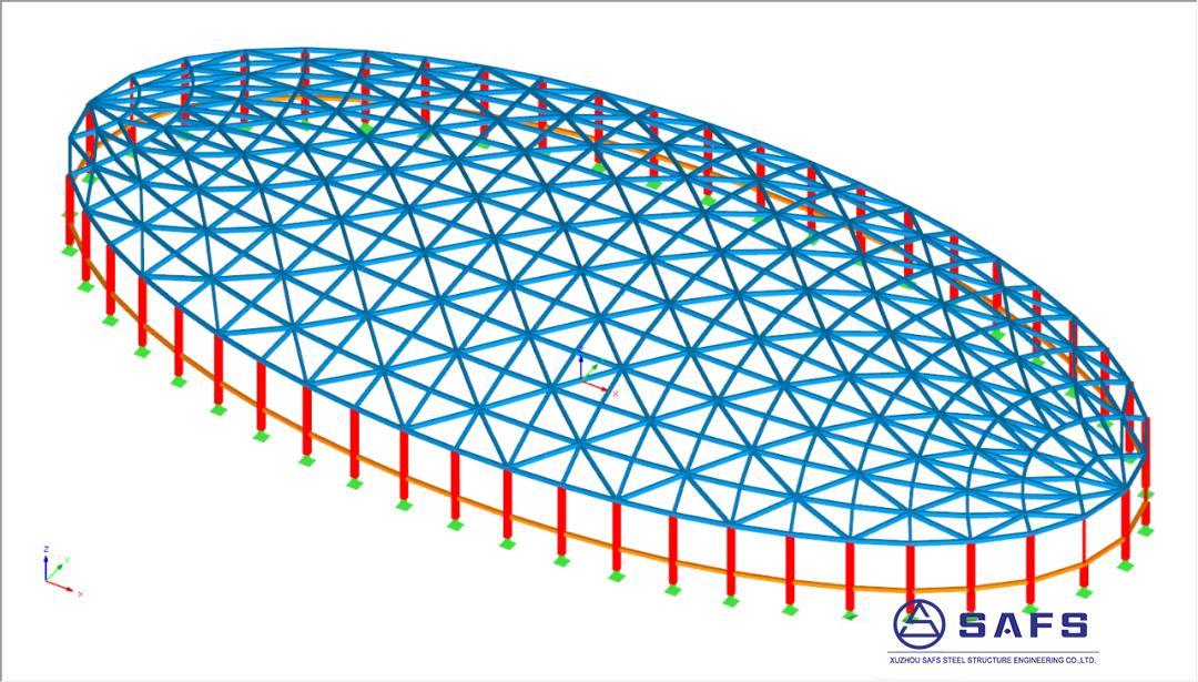 Gymnasium:themaincomponentsofthegymnasiumroofare:mainbearingstructure,support system,edgemembers,supports,etcThemainbearingstructure,suchasmeshshell,trusses, etc.,mainlybearverticalloads;thesupportingsystemandedgememberscontributemoretothe in-planestiffnessandoverallstabilityofthestructure,andconnectthebearingsofeachjoist,so astoimprovethestabilityoftheroof.Itismainlydividedintotwocategories:rigidstructure system(netframe,netshell)andrigid-flexiblehybridstructuresystem(tensionchordstructure)