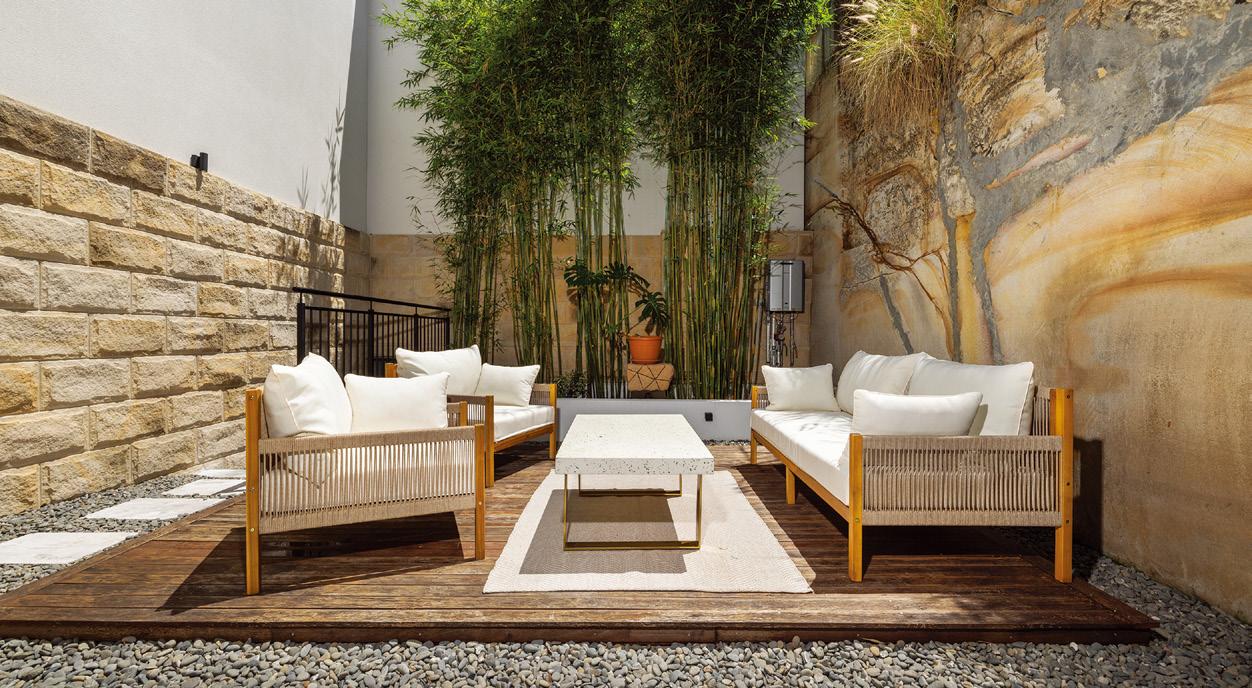 住宅注重可持续发展,配备15千瓦太阳能系统、电热水泵及100,000升 雨水储罐,结合成熟的花园与自给自足的供水系统,展现出对自然环境的深切 关怀。无论是悠闲地在门廊欣赏落日,还是在户外餐区款待亲友,亦或在棚屋 中畅享私人时光,这里都能带来理想的乡村生活体验。