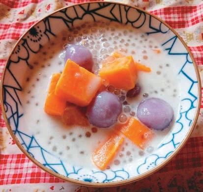 食材: 糯米粉150g、地瓜1顆、西米露100g、 紫高麗菜汁120c.c.、椰奶200c.c.、冰糖30g