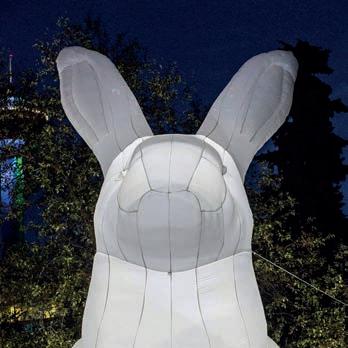 ⇧佛館成佛大道上兩個各高7公尺的充氣「太空兔 」富樂、吉祥,象徵幸福溫暖。