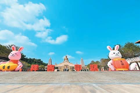 「佛光山2023年燈籠創意彩繪比賽」有來 自海內外、各道場和學校,提供或參賽的彩 繪燈籠,布置在菩提路、32養生蔬食館等處 ;從斜張橋即可望見7公尺高的「雲端巧兔 」、各式兔年造型花燈;「佛光好事集」集 結各地知名素食品牌,讓大家有得吃又有得 觀賞。